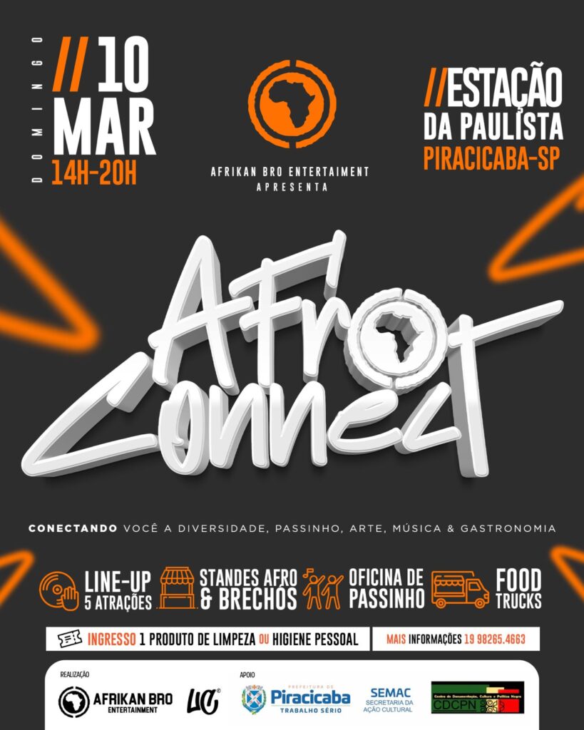 O Afro Connect terá aulas de dança, música black, como o pocket show do rapper piracicabano Daniel Garnet, desfile de moda sustentável e stands de brechós e roupas africanas e DJ. Outras atrações do evento são os Djs Alex Black, Dupikadilha, Rock Jay e Dukailifa, além de MayRow, que faz a dança do passinho.