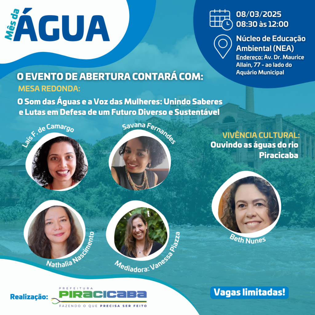 A Prefeitura, por meio do Núcleo de Educação Ambiental (NEA), da Secretaria Municipal de Agricultura, Abastecimento e Meio Ambiente, realiza na sede do NEA, no sábado, 8 de março, Dia Internacional da Mulher, o evento de abertura do Mês da Água, intitulado “O Som das Águas e a Voz das Mulheres: Unindo Saberes e Lutas em Defesa de um Futuro Diverso e Sustentável”, o evento ocorrerá das 08h30 às 12h. As inscrições são gratuitas e podem ser realizadas através do link: https://forms.gle/nErCkQR28VQnx6DB8