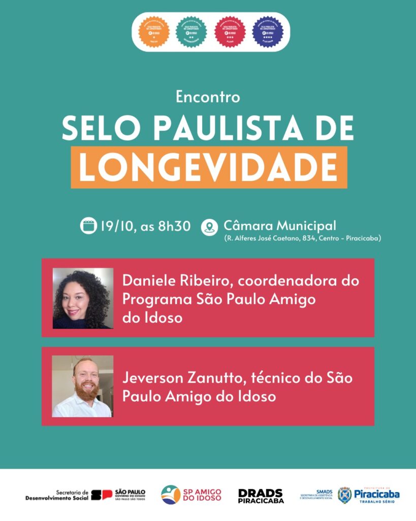 Acontece no dia 19/10, a partir das 8h30, no Salão Nobre da Câmara Municipal, o encontro regional sobre o Selo Paulista de Longevidade, com representantes do Programa São Paulo Amigo do Idoso. O evento, apoiado pela Secretaria Municipal de Assistência e Desenvolvimento Social (Smads), reunirá municípios integrados à Diretoria Regional de Assistência e Desenvolvimento Social (Drads), com o objetivo de orientar e capacitar os municípios paulistas à conquista dos selos certificados como nível inicial, intermediário e pleno.