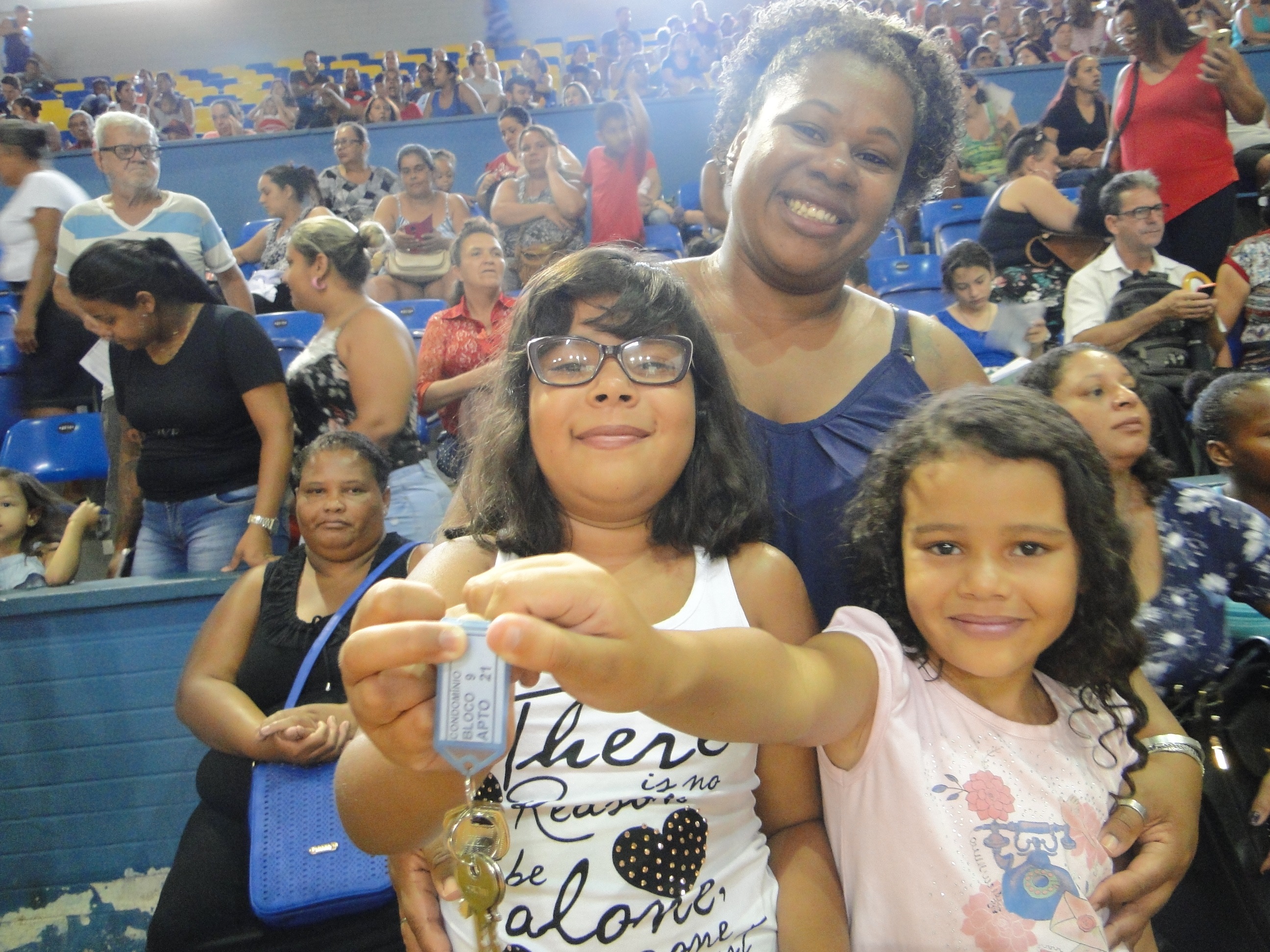 Em meio às centenas de contemplados, três rostos sorridentes se destacavam: o de Ane Raquel Egídio e das filhas Bianca e Bárbara. Só faltou o marido Anderson na cerimônia. A manicure estava inscrita em programas de moradia popular havia 12 anos. "Vou deixar de pagar um aluguel de R$ 800. Com isso posso garantir que as minhas filhas tenham um teto para elas. Agora tenho certeza de que vou pagar uma coisa minha", disse, emocionada.