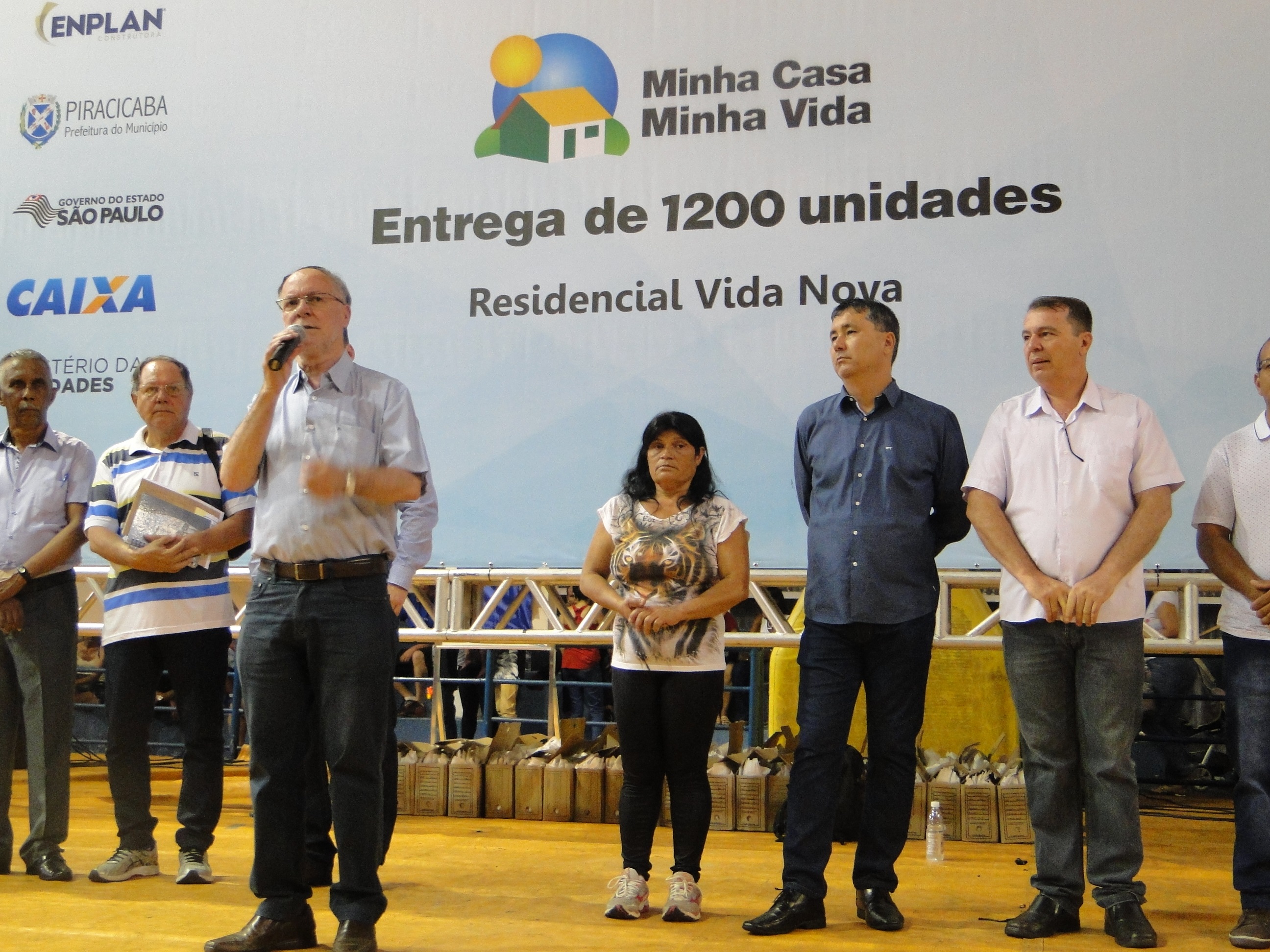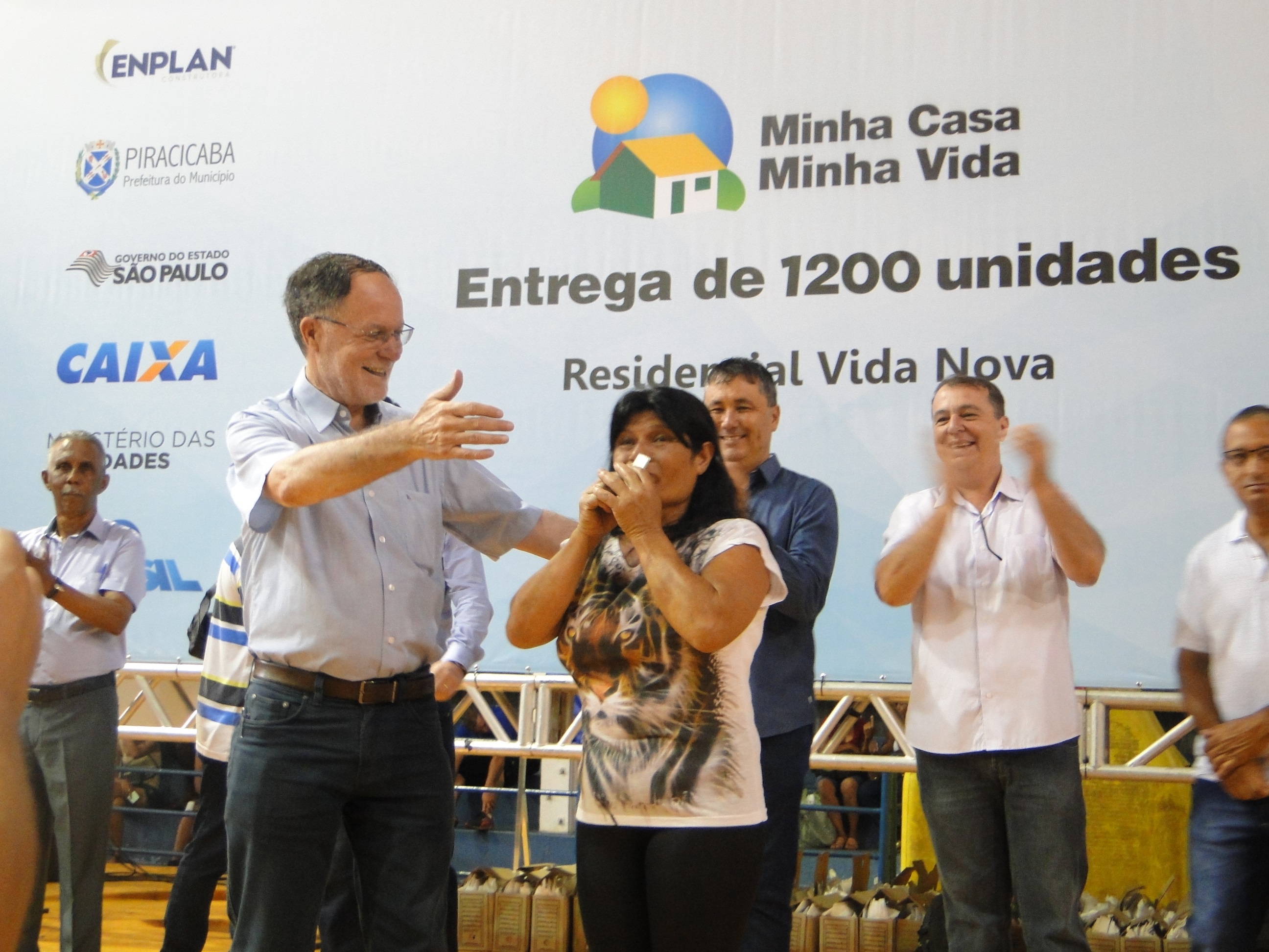 Emoção marcou a cerimônia de entrega das chaves do Vida Nova I, II, III e IV. A realização de um sonho, a garantia de um futuro melhor para a família, para os filhos e, finalmente, o fim do aluguel justificaram a alegria dos 1.200 inscritos contemplados no Minha Casa Minha Vida. O evento, que aconteceu na manhã de hoje, 21/12, no Ginásio Waldemar Blatkauskas, foi realizado pela Prefeitura, por meio da Empresa Municipal de Desenvolvimento Habitacional (Emdhap), em parceria com a Caixa Econômica Federal e o Ministério das Cidades.