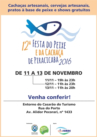 12ª Festa do Peixe e da Cachaça de Piracicaba Dia 11 – sexta-feira – das 19h às 23h Dia 12 – sábado – das 11h às 23h Dia 13 – domingo – das 11h às 20h Local: Rua do Porto – no entorno do Casarão do Turismo