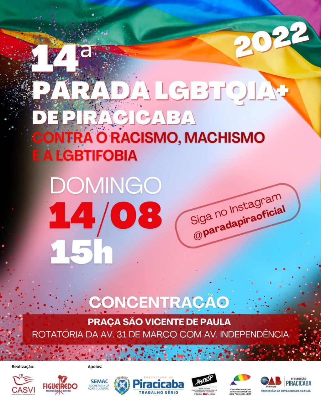 Acontece no domingo, 14/08, a partir das 15h, a 14ª edição da Parada LGBTQIA+ (Lésbicas, Gays, Bissexuais, Travestis, Transexuais, Transgêneros, Queer, Intersexo e Assexual) de Piracicaba, com o tema Contra o Racismo, o Machismo e a LGBTIfobia!. A concentração dos trios elétricos será na Praça São Vicente de Paulo, próximo à rotatória entre as avenidas Independência e 31 de Março. O evento, gratuito, segue para o Parque do Engenho Central. A Parada é uma realização da ONG Casvi (Centro de Apoio e Solidariedade à Vida) e Figueiredo Produção Cultural, com apoio da Prefeitura de Piracicaba, por meio da Secretaria Municipal da Ação Cultural (Semac).