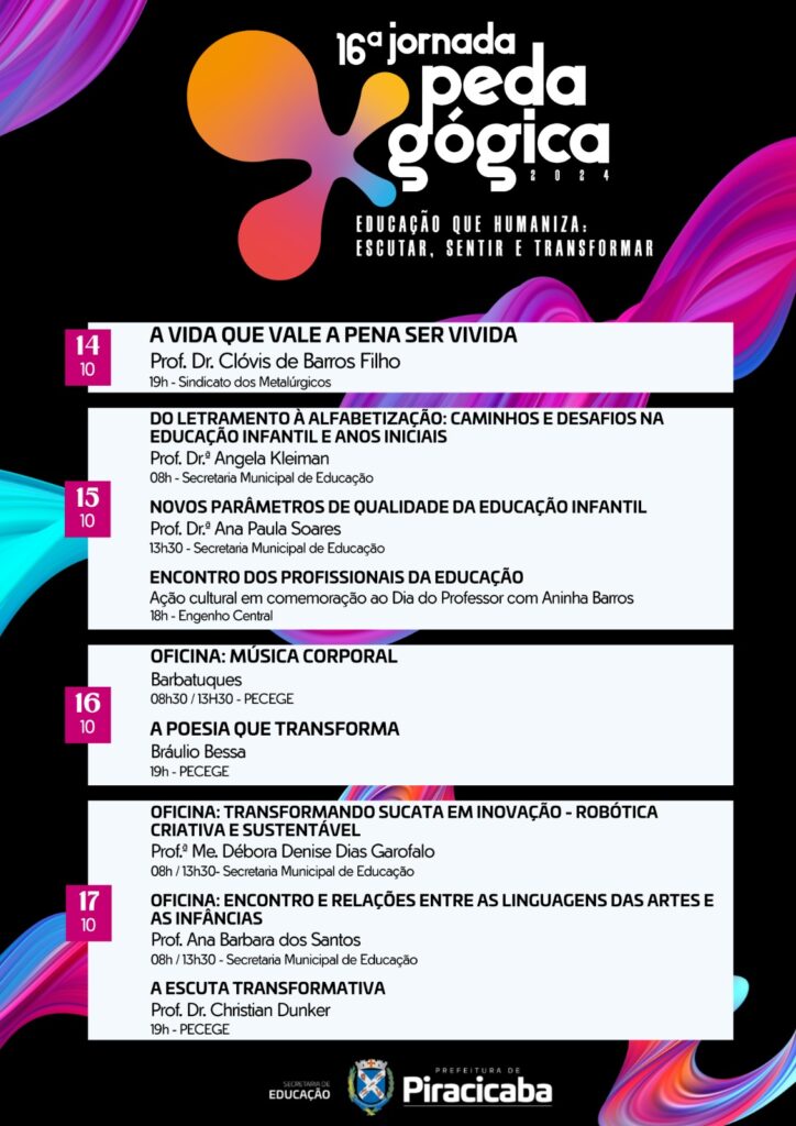 A 16ª edição da Jornada Pedagógica, evento realizado pela Secretaria Municipal de Educação de Piracicaba, teve mais de 4.800 inscrições para os quatro dias de evento, que começa na segunda-feira, 14/10, e segue até quinta, 17/10.