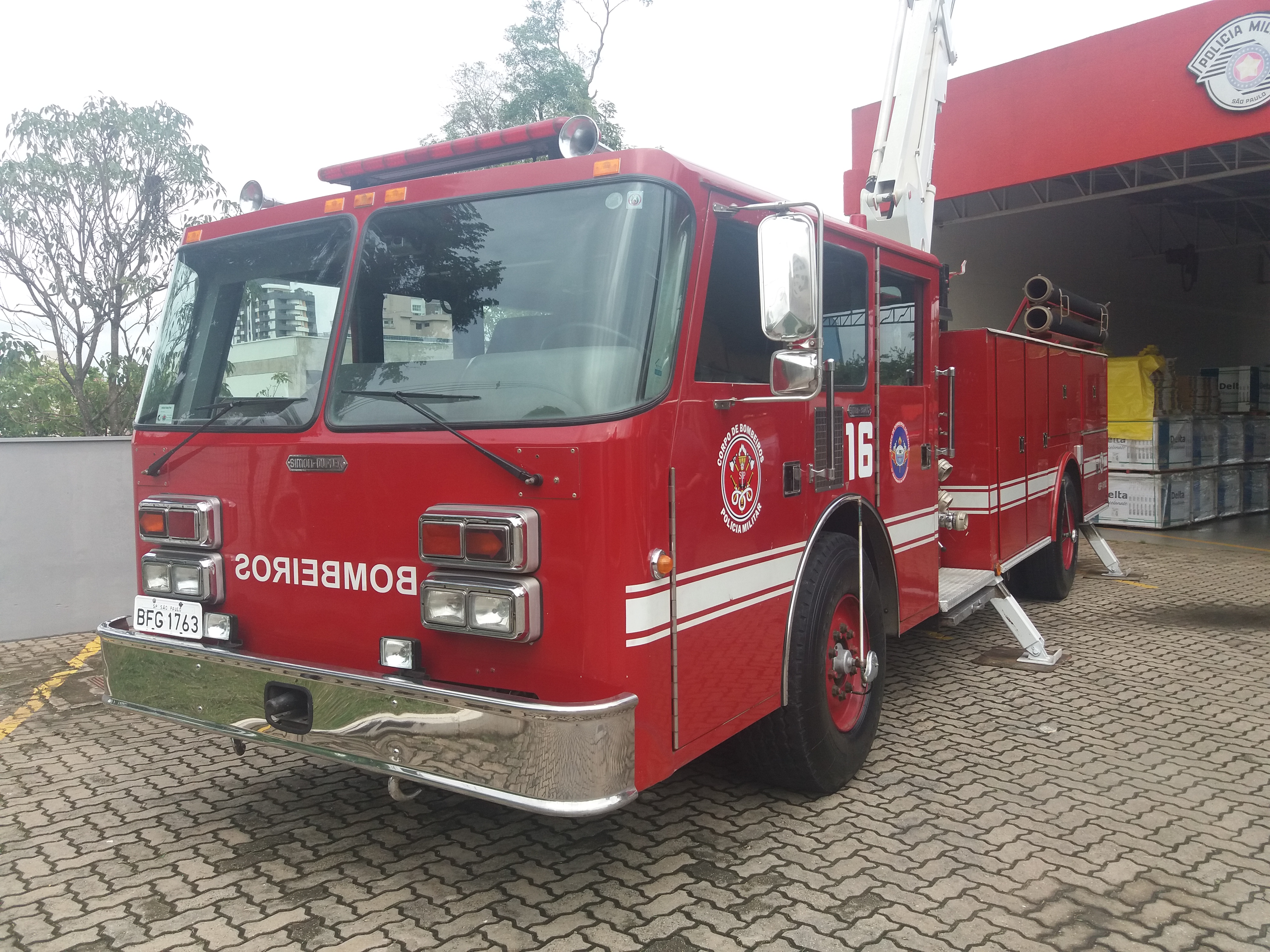 A viatura possui uma plataforma elevatória que pode alcançar 18 metros de altura