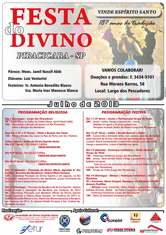 Piracicaba, 05 de julho de 2013 – A 187ª edição da Festa do Divino começa no próximo domingo (dia 7 de julho), com missa no Largo dos Pescadores às 9h, seguida pela derrubada e bênção dos barcos no rio Piracicaba e também bênção das bandeiras.