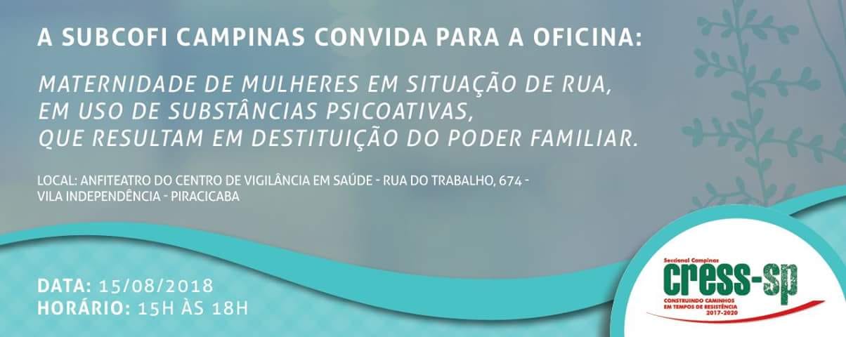 As Secretarias de Saúde (SMS) e de Desenvolvimento Social (Semdes) realizarão na próxima quarta-feira(15/08) uma oficina sobre o tema Maternidade de Mulheres em Situação de Rua, em uso de substâncias psicoativas, que resultam em destituição do poder familiar. Será ministrada pela equipe do SubComissões de Orientação e Fiscalização Profissional (SUBCOFI – Campinas), no Anfiteatro do Centro de Vigilância em Saúde (Cevisa), às 15 horas.