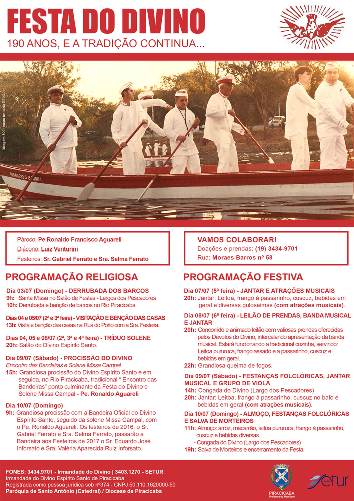 Começa no próximo domingo, dia 03 de julho, a 190ª edição da Festa do Divino, com missa no Largo dos Pescadores, a partir das 9h, e derrubada e bênção dos barcos no rio Piracicaba a partir das 10h. Nos dias 04, 05 e 06 (segunda, terça e quarta-feira) acontece parte da programação religiosa do evento, com a realização do tríduo solene e da visitação e benção das casas.