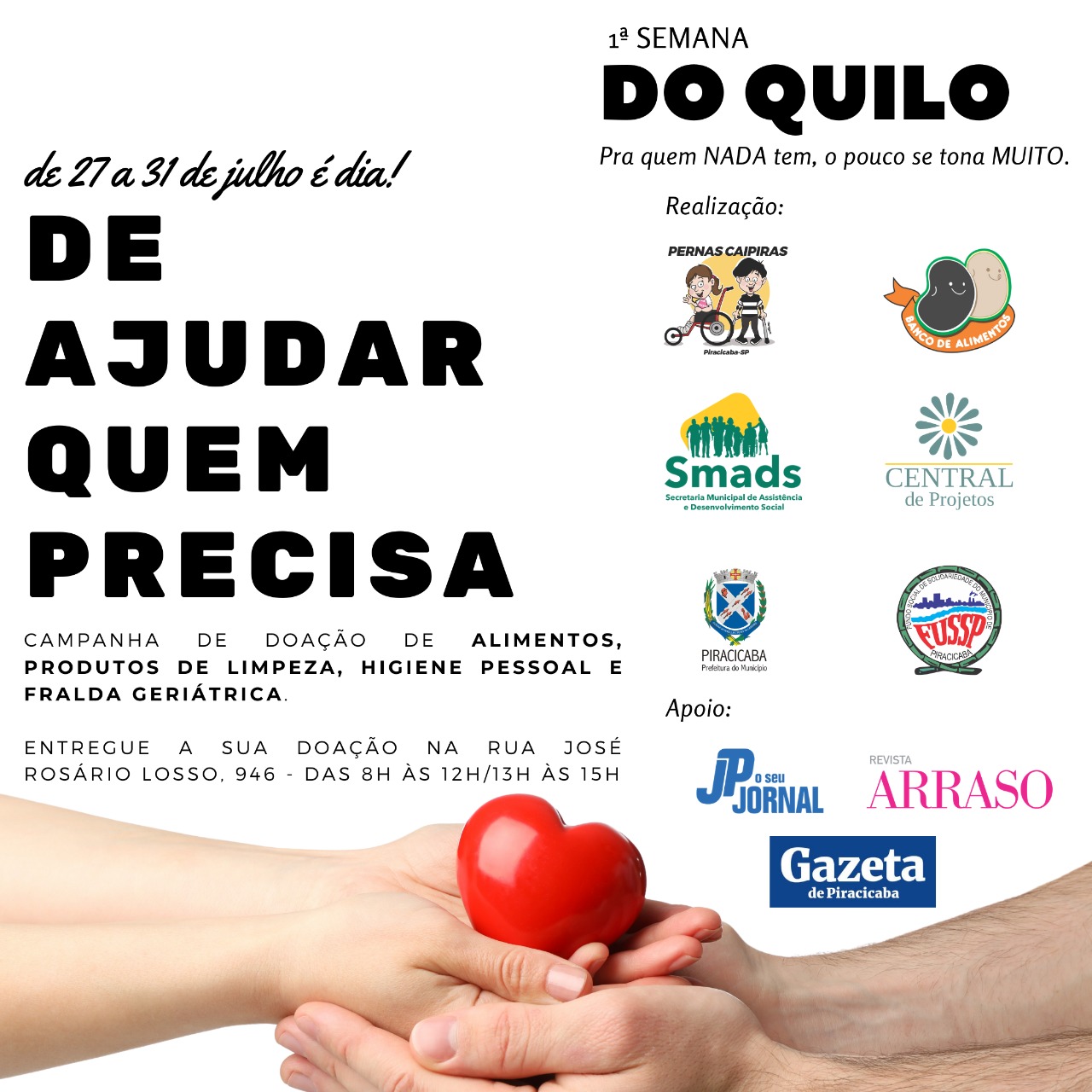 A iniciativa da Semana do Quilo é da ONG Pernas Caipiras em parceria com a Prefeitura, por meio do Fundo Social de Solidariedade (Fussp) e da Smads. A Semana conta com o apoio da Gazeta de Piracicaba, Jornal de Piracicaba e Revista Arraso.