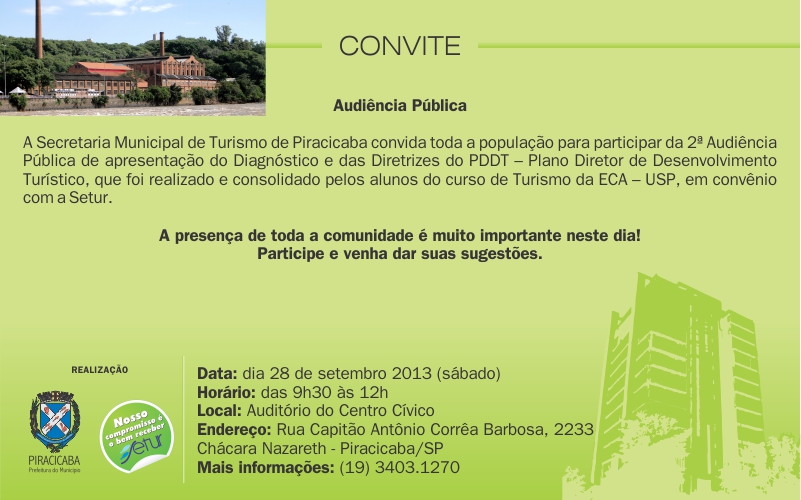 A Secretaria Municipal de Turismo de Piracicaba convida toda a população para participar da 2ª Audiência Pública de apresentação do Diagnóstico e das Diretrizes do PDDT – Plano Diretor de Desenvolvimento Turístico, que foi realizado e consolidado pelos alunos do curso de Turismo da ECA – USP, em convênio com a Setur. Esta Audiência seria realizada no mês de agosto, mas foi adiada para o mês de setembro. A presença de toda a comunidade é muito importante neste dia! Participe e venha dar suas sugestões. Data: dia 28 de setembro 2013 (sábado) Horário: das 9h30 às 12h Local: Auditório do Centro Cívico Endereço: Rua Capitão Antônio Corrêa Barbosa, 2233 – Chácara Nazareth – Piracicaba/SP Mais informações: (19) 3403.1270