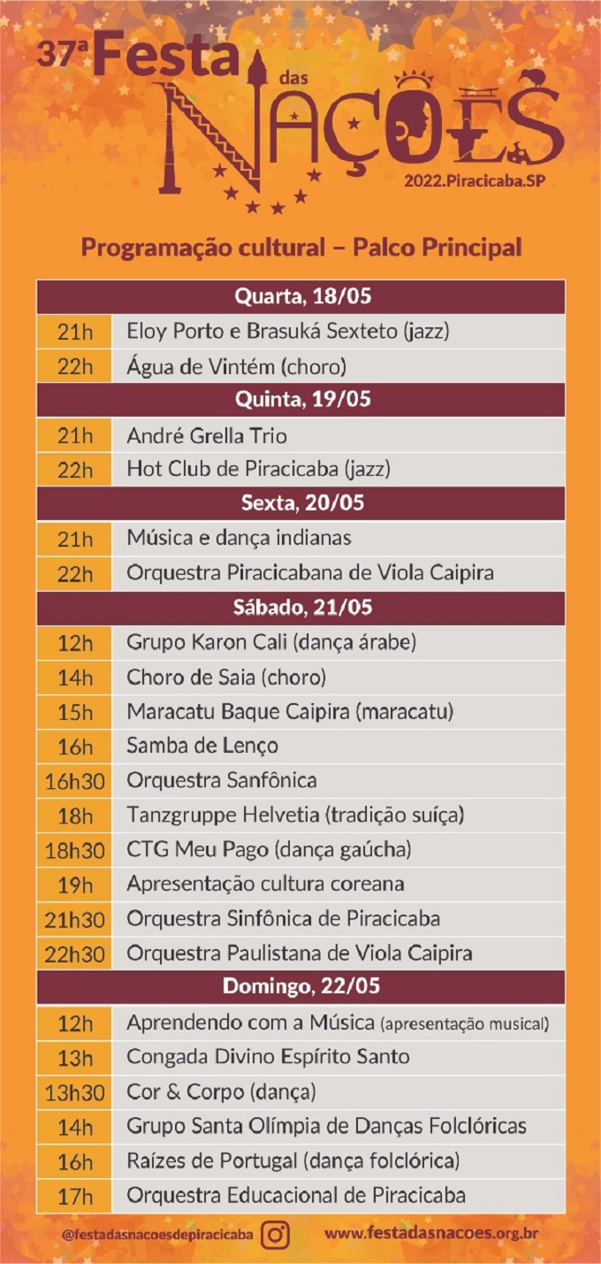 Viola caipira, chorinho, MPB, jazz, música clássica, danças folclóricas… A 37ª Festa das Nações de Piracicaba terá mais de 20 shows no palco principal, durante os cinco dias, com artistas de Piracicaba e de diversas outras cidades. A Festa das Nações começa na semana que vem, quarta-feira, 18/05, e segue até domingo, 22/05, no Engenho Central. Na quarta, quinta e sexta, a festa começa às 19h. No sábado e no domingo, às 11h.
