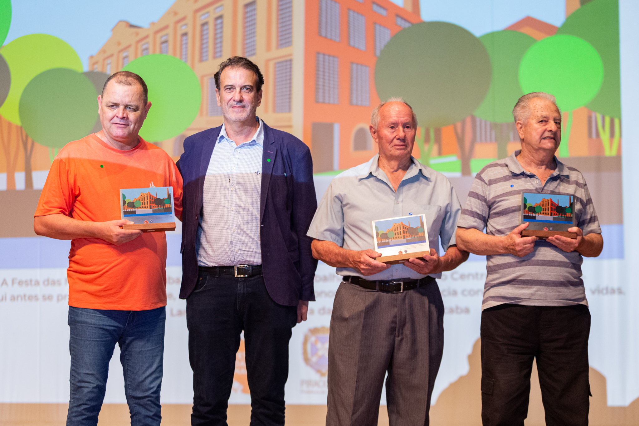 HOMENAGENS – O evento contou ainda com duas homenagens. A primeira, dedicada a funcionários e ex-funcionários do Engenho Central, agraciou os senhores Vlademir Sérgio Bisso e João Gibim, que trabalharam na antiga usina de açúcar, e o subtenente aposentado da Polícia Militar do Estado de São Paulo e atual diretor do Engenho Central, Antonio Domingos Padovan, representando seu avô, o senhor Alberto Carnicelli, que também atuou na usina. O prefeito Luciano Almeida entregou uma placa aos homenageados, com arte cedida pelo cartunista Erasmo Spadotto.
