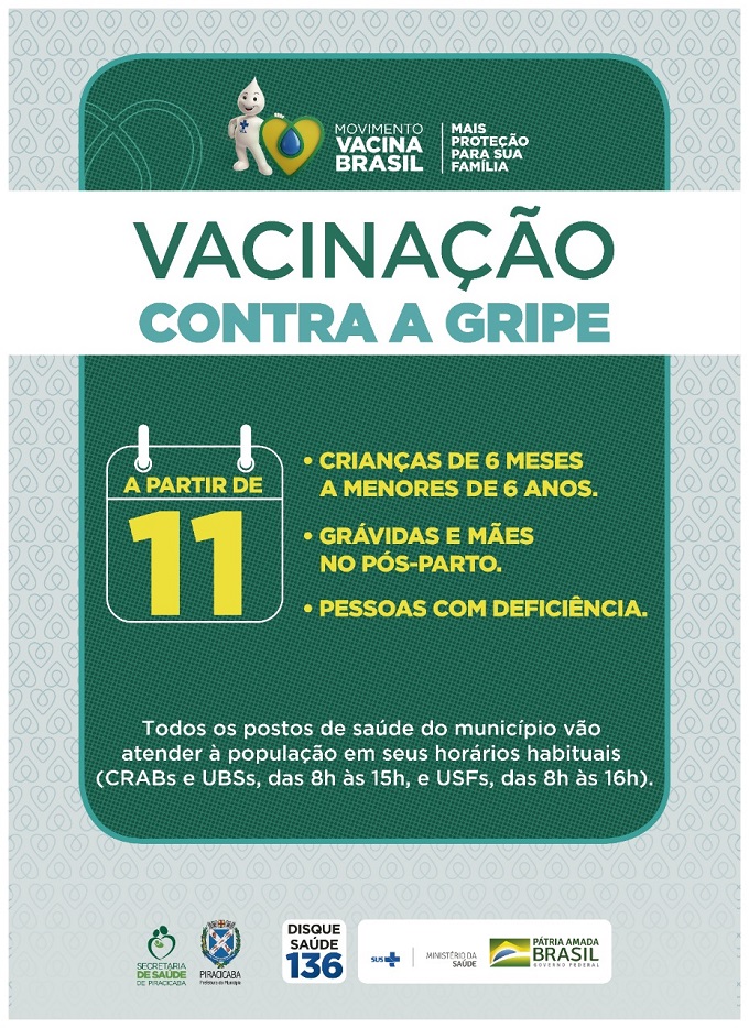 A Prefeitura de Piracicaba, por meio da Secretaria Municipal de Saúde, inicia na segunda-feira (11), a primeira etapa da terceira fase da 22ª Campanha Nacional de Vacinação contra a Influenza para os novos grupos prioritários: crianças de seis meses a menores de seis anos de idade; pessoas com deficiência; gestantes; e puérperas até 45 dias. Desde o dia 23 de março, quando começou a campanha, Piracicaba já vacinou cerca de 80 mil pessoas.