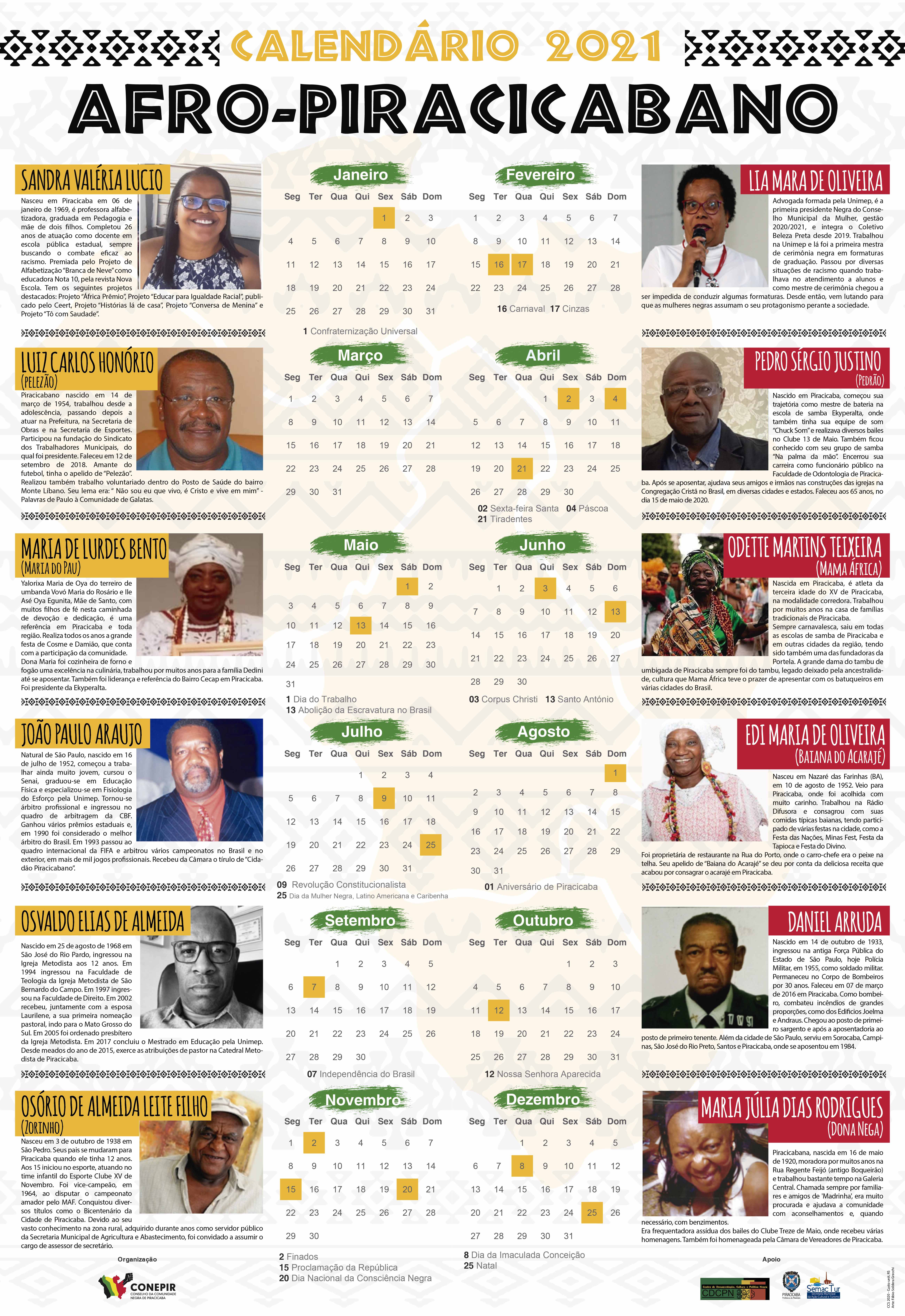 A Prefeitura de Piracicaba, em parceria com o Conselho de Participação e Desenvolvimento da Comunidade Negra de Piracicaba (Conepir) e o Centro de Documentação, Cultura e Política Negra de Piracicaba (CDCPN), lança no próximo dia 16, o 3º Calendário Afro-piracicabano/2021 que traz, além das datas, as fotos e os currículos resumidos de 12 personalidades ligadas à luta e à defesa da cultura afro-brasileira na cidade. A proposta também tem o apoio da Secretaria Municipal da Ação Cultural e Turismo (SemacTur).