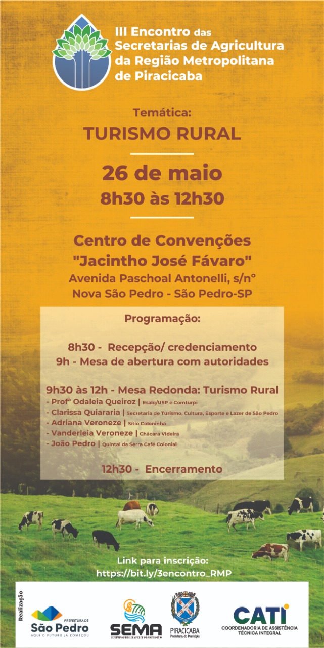 O 3º Encontro de Secretarias de Agricultura da Região Metropolitana de Piracicaba (RMP), acontece amanhã, quinta-feira, 26/05, das 8h30 às 12h30, no Centro de Convenções de São Pedro.