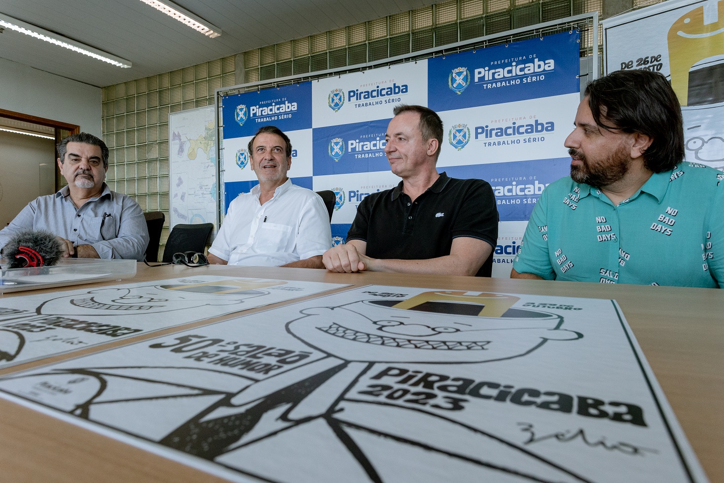 Carlos Beltrame, prefeito Luciano Almeida, Paulo Bonfá e Junior Kadeshi no lançamento do cartaz da 50 edição