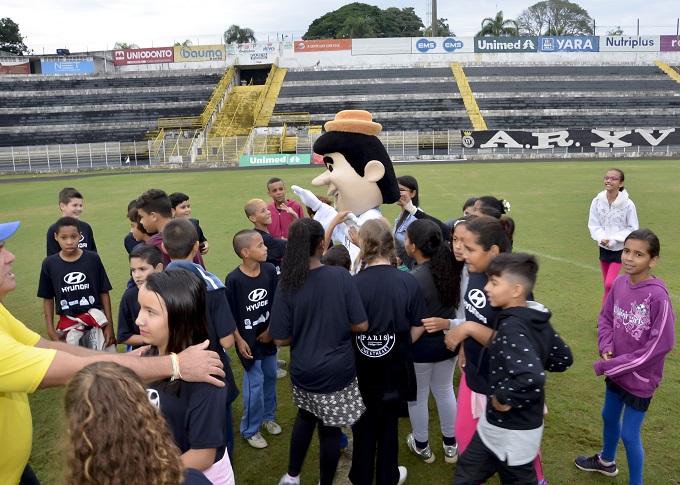 Crianças com o Nhô Quim, mascote do time do XV de Piracicaba: aprendizado e diversão