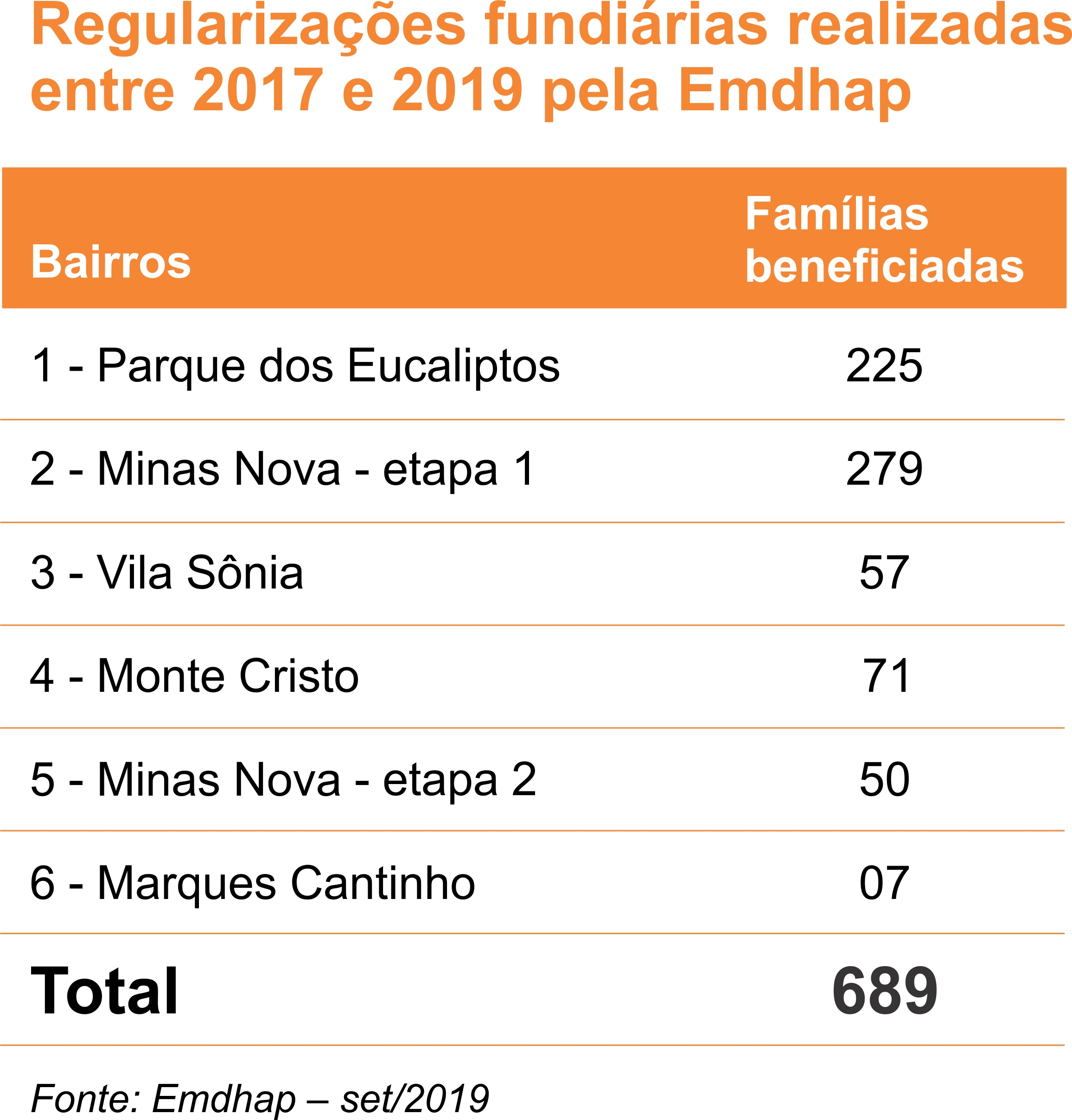 Desde o início do terceiro mandato do prefeito Barjas Negri, a Emdhap já entregou 689 escrituras para os moradores do Parque dos Eucaliptos (255), Minas Nova (279), Vila Sônia (57) e Monte Cristo (71). No final deste mês, 7 famílias do Marques Cantinho também receberão as suas escrituras. E, para outubro, segundo a Emdhap será a vez de mais 50 moradores do Minas Nova receberam as suas escrituras.
