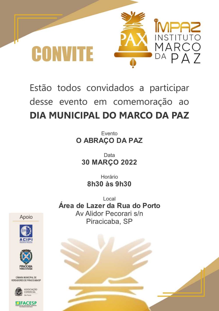 O evento tem realização do Impaz (Instituto Marco da Paz) e conta com o apoio da Prefeitura, da Câmara Municipal de Piracicaba e da Acipi (Associação Comercial e Industrial de Piracicaba), ACSP (Associação Comercial de São Paulo) e Facesp (Federação das Associações Comerciais do Estado de São Paulo). O monumento, em formato de arco, além de detalhes em granito preto e mármore branco, possui um sino e duas mãos juntas em forma de pomba, acompanhado da expressão pax (palavra que em latim significa paz). O Marco da Paz foi construído em Piracicaba em 2016, em três meses, numa iniciativa da Prefeitura, junto com a Acipi e a Facesp, sem injeção de recursos públicos, por meio de uma mobilização de entidades signatárias (lista completa está no final da matéria) do movimento Marco da Paz em Piracicaba.