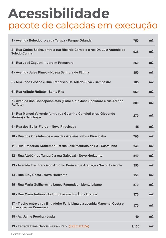 A Prefeitura contratou um pacote de obras de execução de calçadas em 19 pontos de Piracicaba(veja quadro anexo). A empresa vencedora da licitação foi a Hexagonal Construtora e o investimento é de R$ 365 mil. Juntas, as calçadas somam 9.420 metros quadrados.