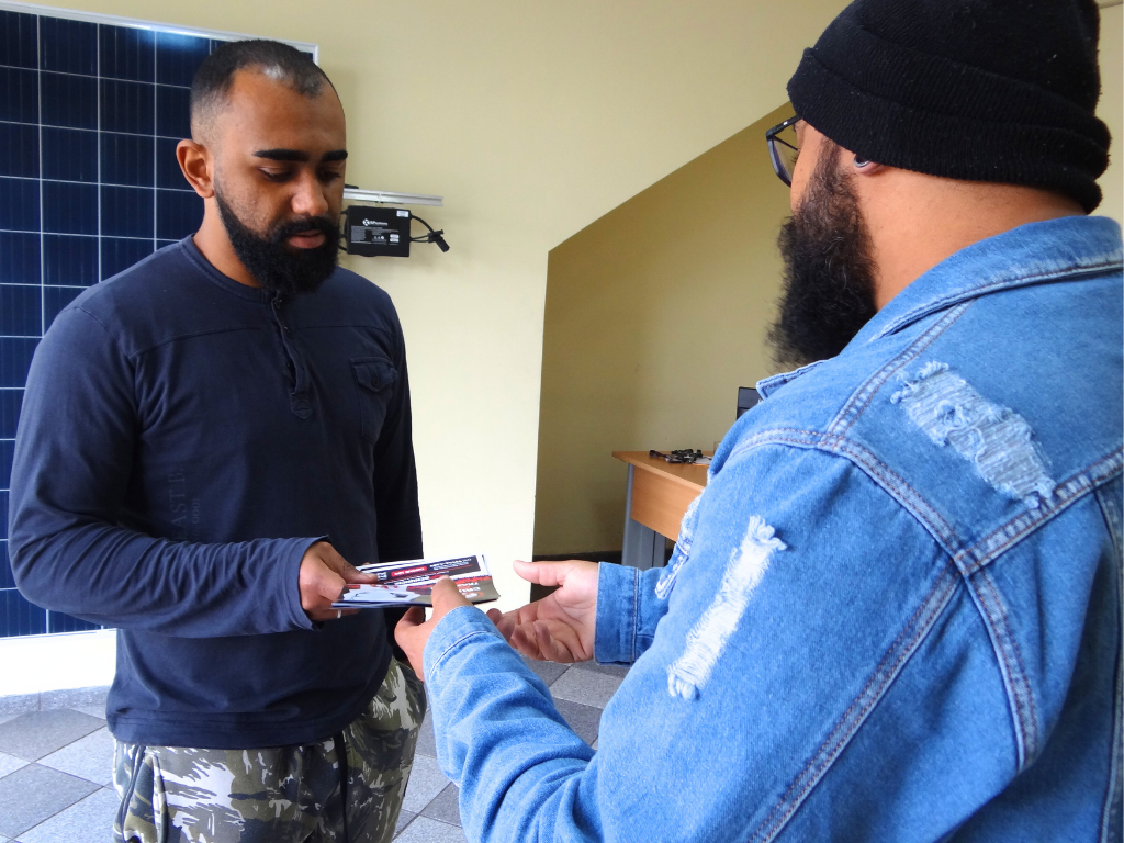 Gabriel Souza, funcionário de comércio, recebendo orientações e material