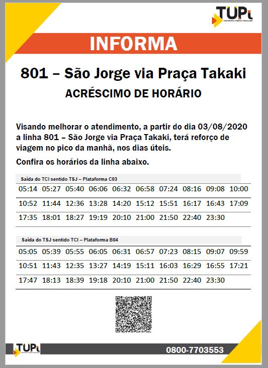 Acréscimo de horário para a linha 801 – São Jorge via Praça Takaki