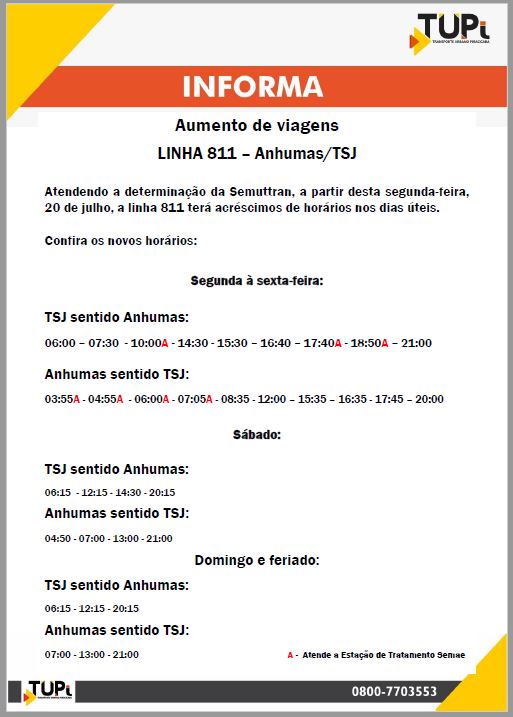 Acréscimo de viagens para a linha 811 – Anhumas/TSJ