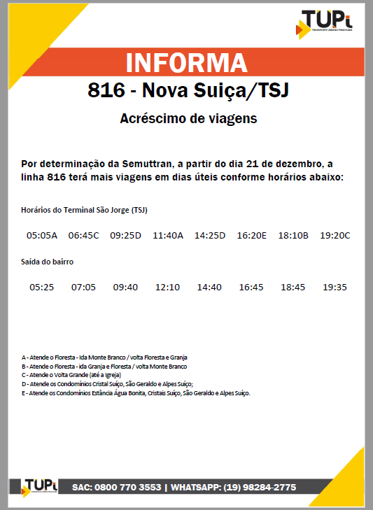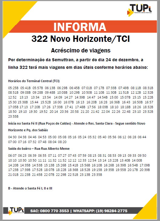 Acréscimo de viagens para as linhas 322-Novo Horizonte/TCI e 816-Nova Suíça/TSJ