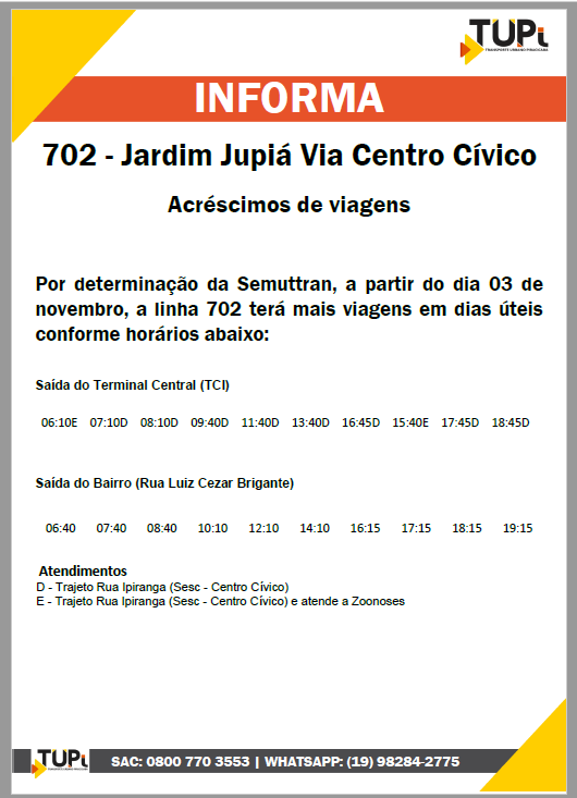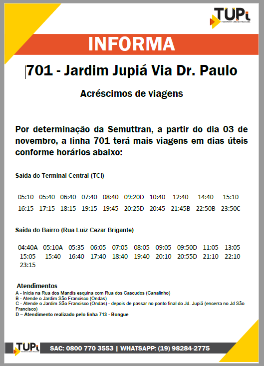 Acréscimo de viagens para as linhas 701 e 702 – Jardim Jupiá