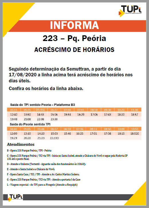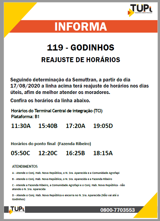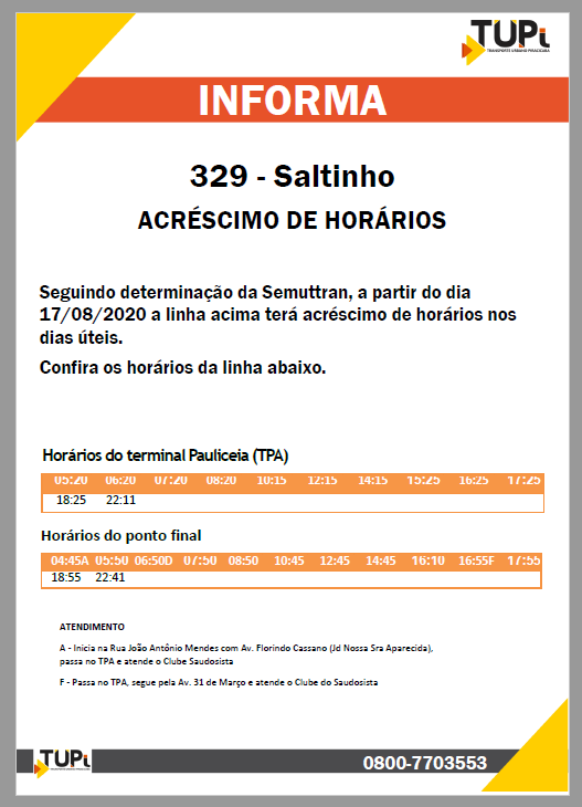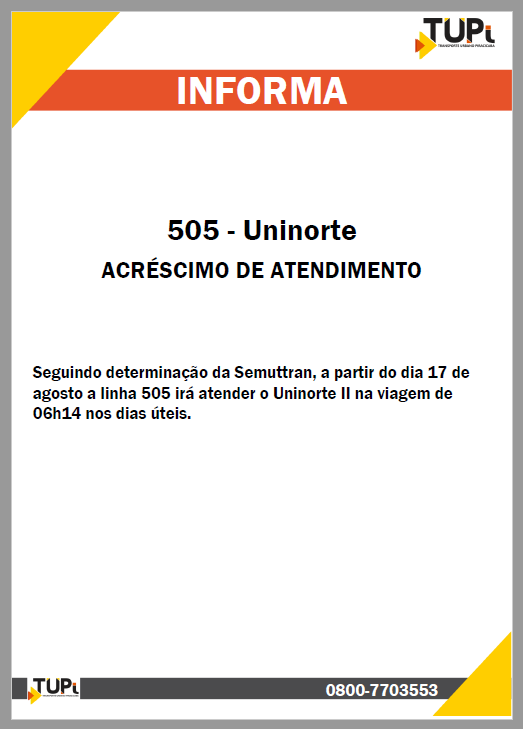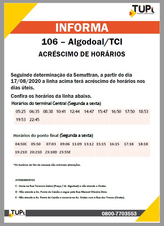 Visando melhorar o atendimento à população, a Semuttran informa novos acréscimos e reajustes nas linhas 501-Tanquinho/TCI, 119-Godinhos, 329-Saltinho, 106-Algodoal/TCI, 505-Uninorte e 503-Santa Rosa/TCI e 223-Parque Peória: