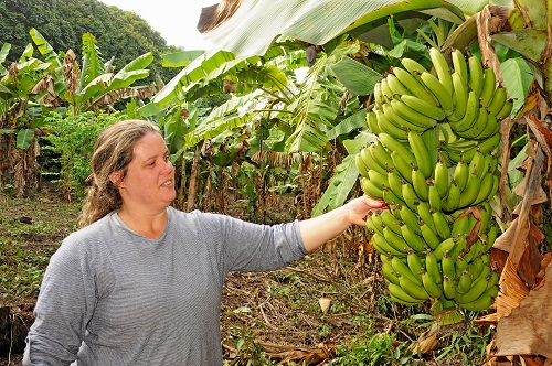 Silvia Fornazieiro mostra cacho de banana produzido em seu sítio, no Campestre