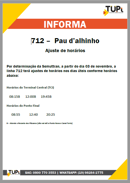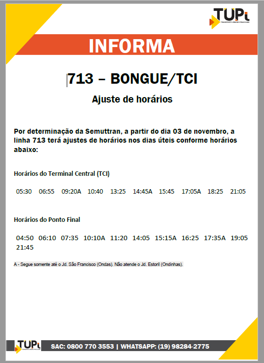 Ajustes de horários para as linhas 712-Pau D’alhinho e 713-Bongue/TCI