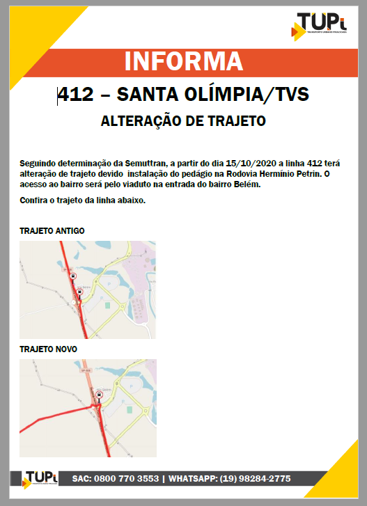 Alteração de trajeto para a linha 412-Santa Olímpia/TVS