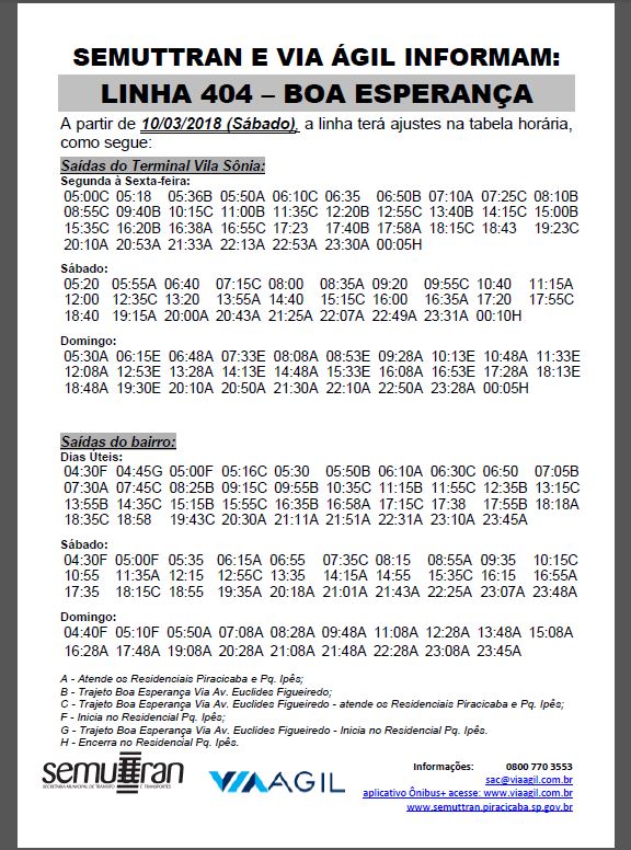 A Semuttran e a Via Ágil decidiram ajustar a tabela horária da Linha 404 – Boa Esperança para melhor atender os usuários do transporte público desta região.