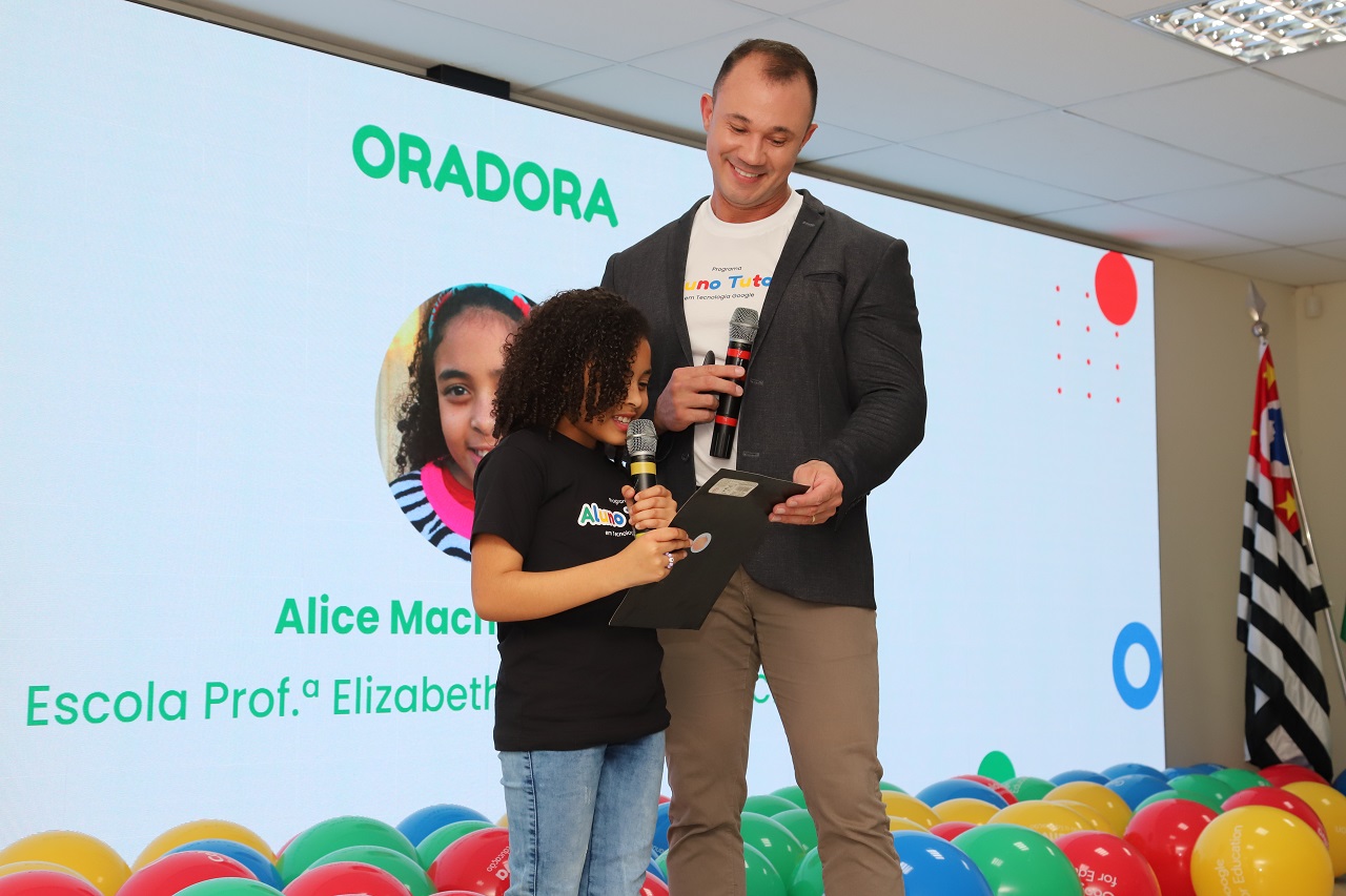 O juramento proferido pelo aluno Gusttavo Henrique de Oliveira, da escola Professora Elizabeth Consolmagno Cruz, e o discurso de agradecimento feito pela aluna Alice Machado Costa da Escola Fábio de Souza Maria, trouxeram a emoção para a cerimônia. “Foi um dia de muito aprendizado em que todos nós aprendemos a mexer nos chromebooks. Foi muito legal toda essa experiência. Aprendi muito sobre os aplicativos Google. Tudo que eu aprendia nas aulas de quinta, durante o curso, passava na sexta para a minha turma da escola e ganhei o apelido de prô”, destacou a oradora da turma.