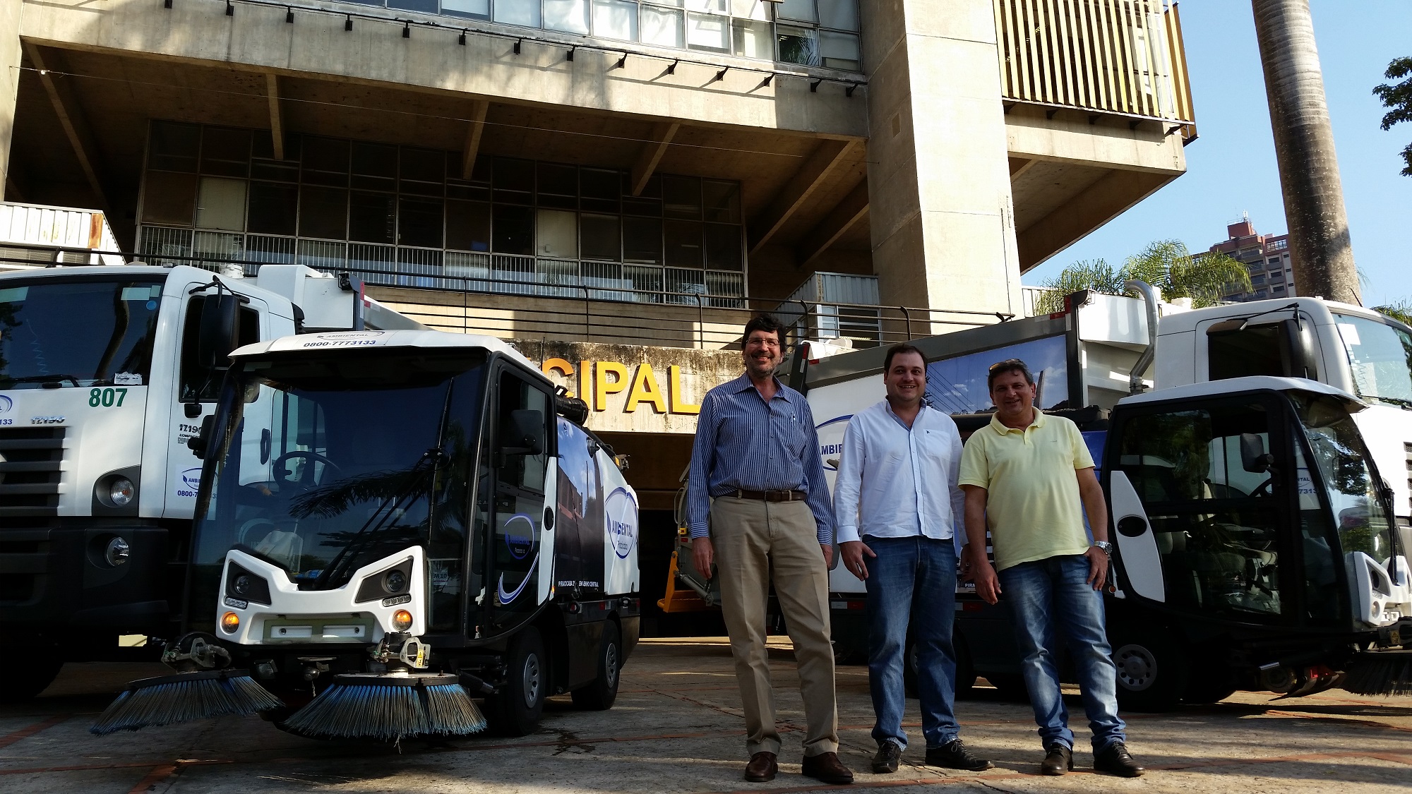 Secretário José Otávio Machado Menten, Thiago Angeleli, engenheiro ambiental da Sedema e Claudionor Lira, gerente da Piracicaba Ambiental Os caminhões são da marca Volkswagen modelo Compactor 17.230, com tração 4×2, a capacidade é de 9 toneladas, o mesmo foi desenvolvido exclusivamente para este segmento, priorizando o alto índice de produtividade e segurança na operação. Já a varredeira é da marca Johnston sub-compacta, de origem inglesa, e foi projetada para realizar trabalhos de varrição leve e recolhimento de folhas, garrafas pet, papéis de modo geral e terra em pequenas quantidades, realizando o trabalho de limpeza de praças com mais precisão e agilidade.