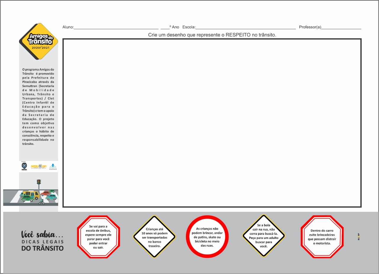 Após um ano suspensa devido à pandemia, a campanha Amigos do Trânsito, realizada pela Secretaria de Mobilidade Urbana, Trânsito e Transportes de Piracicaba (Semuttran), retoma a edição 2021 e será executada em 19 escolas municipais de ensino fundamental, que retirarão materiais lúdicos sobre segurança e educação no trânsito para serem trabalhados com cerca de 5.000 crianças do 1º ao 5º ano. Os trabalhos selecionados pelas escolas servirão de base para ações educativas em 2022. Todas as escolas municipais de ensino fundamental foram convidadas para ação pela Secretaria Municipal de Educação (SME) e puderam se inscrever por meio de link até 20/10. Jane Franco Oliveira, titular da Semuttran, lembrou que a SME é parceira de longa data na proposta de consciência e responsabilidade no trânsito. "A educação sempre foi parceira neste projeto. Produzimos todo um material de divulgação, como vídeo, link para inscrição e um arquivo detalhando o cronograma do projeto e a Secretaria de Educação enviou para todas as escolas públicas de 1º ao 5º ano. Tivemos um bom retorno", conta.