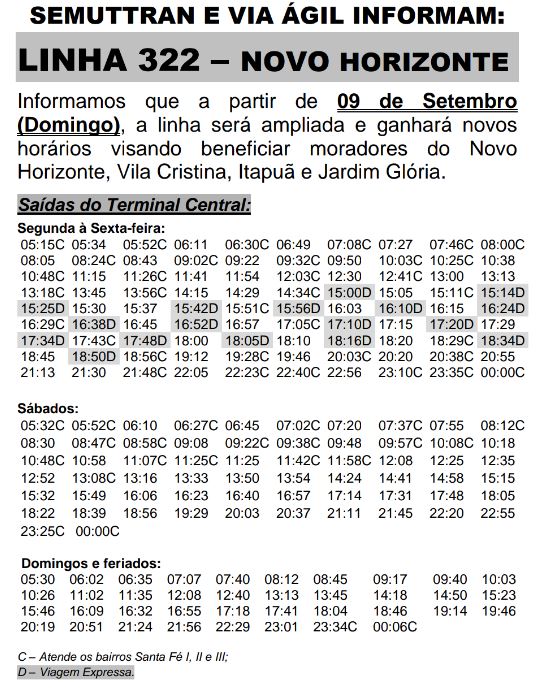 A partir do dia 09 de setembro (domingo), a Linha 322 – Novo Horizonte será ampliada.