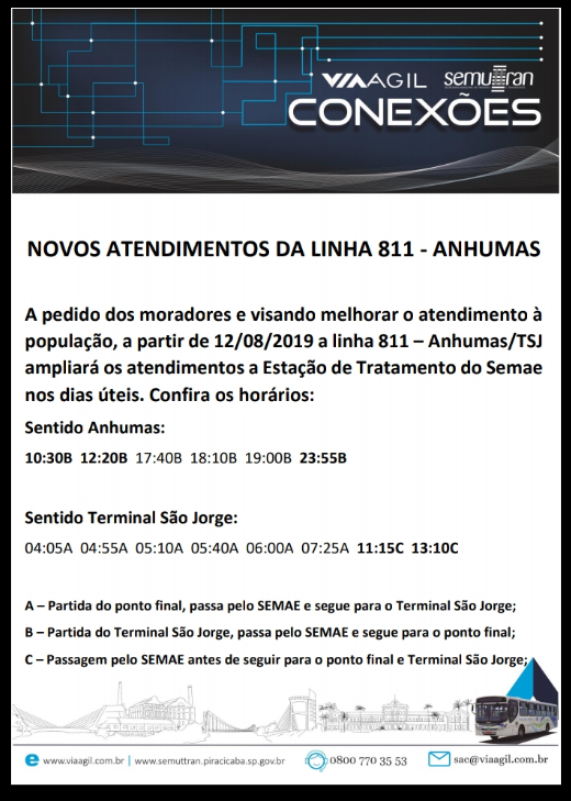 A partir de segunda-feira, 12, a Linha 811 – Anhumas/TSJ ampliará o atendimento a Estação de Tratamento do Semae nos dias úteis, conforme abaixo:
