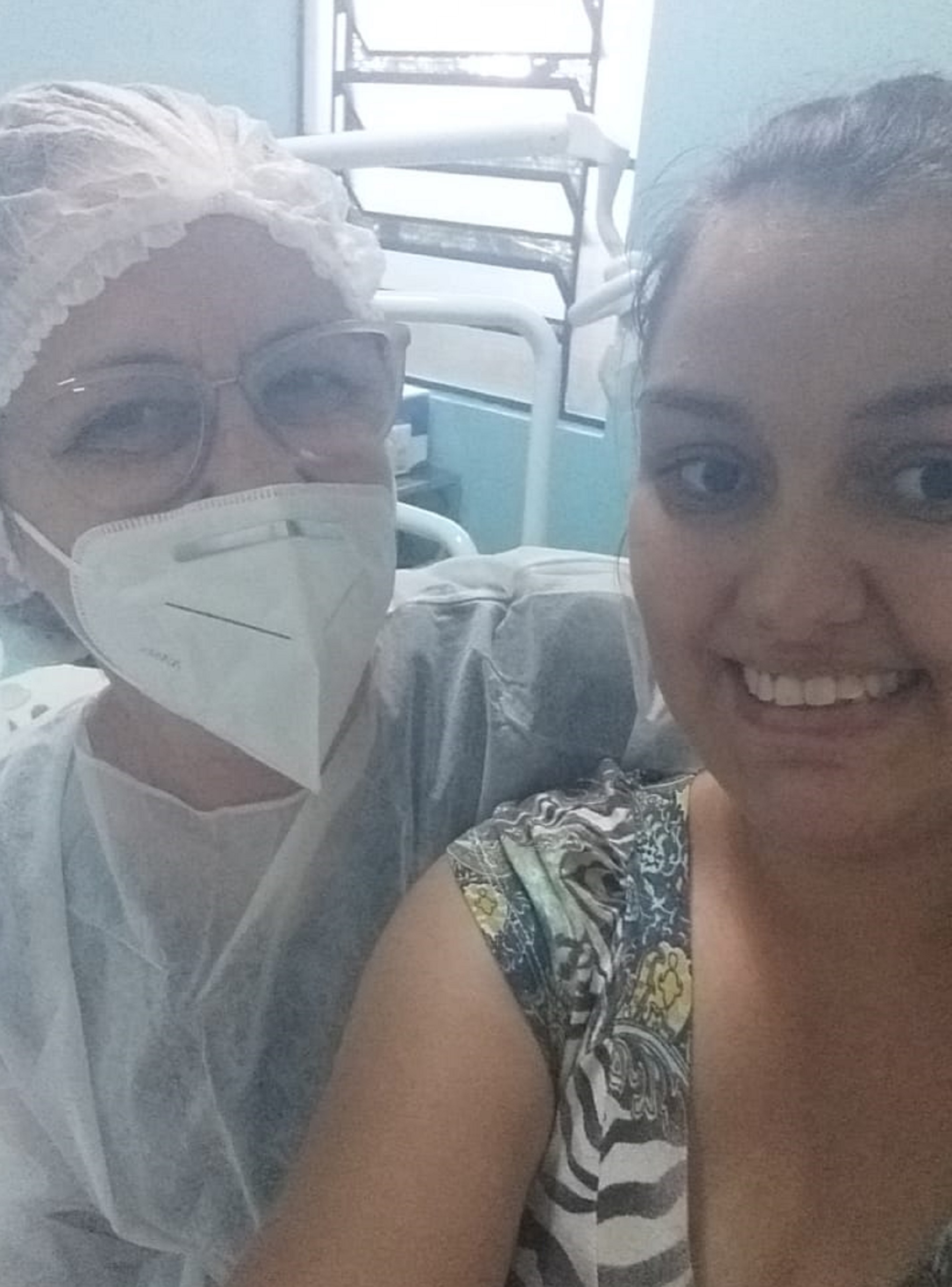 Ao final da consulta, a paciente e a dentista visivelmente felizes, apesar das máscaras, por mais esta conquista.