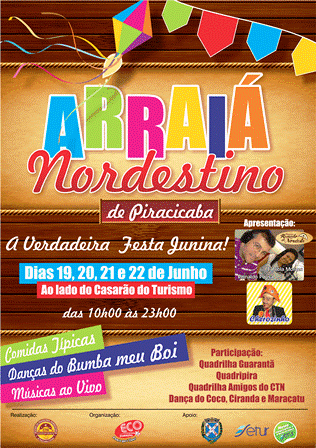 Arraiá Nordestino de Piracicaba Dias e horário: 19, 20, 21 e 22 de junho, das 10h às 23h Local: ao lado do Casarão do Turismo, na Rua do Porto – Av. Alidor Pecorari, s/n Informações sobre o evento: Centro de Tradições Nordestinas – Telefone 3035.2565 Entrada Franca