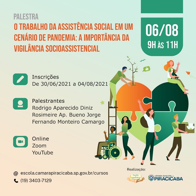 A Prefeitura, por meio da Secretaria Municipal de Assistência e Desenvolvimento Social (Smads), realiza na sexta-feira 06/08, às 9h, palestra em parceria com a Escola do Legislativo, da Câmara de Vereadores. O tema será O Trabalho da Assistência Social em um Cenário de Pandemia: a Importância da Vigilância Socioassistencial. O encontro online trará o convidado Rodrigo Aparecido Diniz, assistente social da Prefeitura de São Paulo, docente e pesquisador do Núcleo de Estudos e Pesquisas Identidades e Narrativas Orais e do Grupo de Estudos e Pesquisas Cidades e Territórios da PUC-SP. Além do convidado, ministrarão a palestra profissionais do núcleo de Educação Permanente da Smads, Rosimeire Bueno Jorge, assistente social, e Fernando Monteiro Camargo, sociólogo. A palestra irá promover a reflexão sobre os desafios da assistência social em tempos de pandemia, a reinvenção desse trabalho e a importância da vigilância socioassistencial, com apresentação do trabalho deste núcleo em Piracicaba. Será gratuita e aberta a todos os interessados, principalmente profissionais da rede de Assistência Social do município e região, estudantes de Serviço Social e Psicologia. As inscrições podem ser feitas até quarta-feira, 04/08, pelo site escola.camarapiracicaba.sp.gov.br. Evento via Zoom e os inscritos receberão o link de acesso por email e/ou WhatsApp.