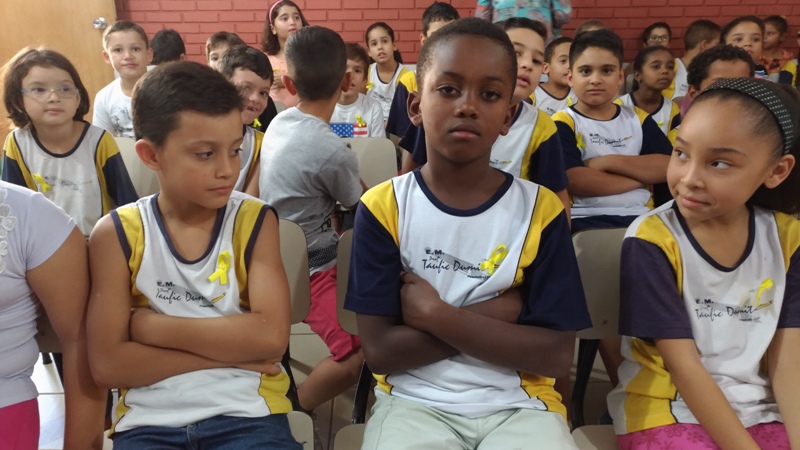 Durante as atividades alusivas ao mês de maio, os alunos estão recebendo a fitinha amarela como símbolo do Movimento, que tem a finalidade de chamar a atenção da sociedade civil para que a violência no trânsito seja reduzida em todo país.