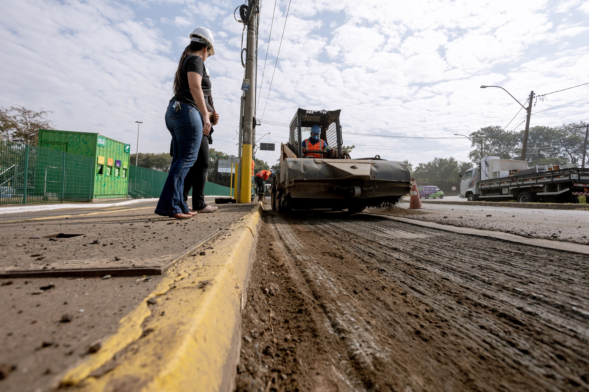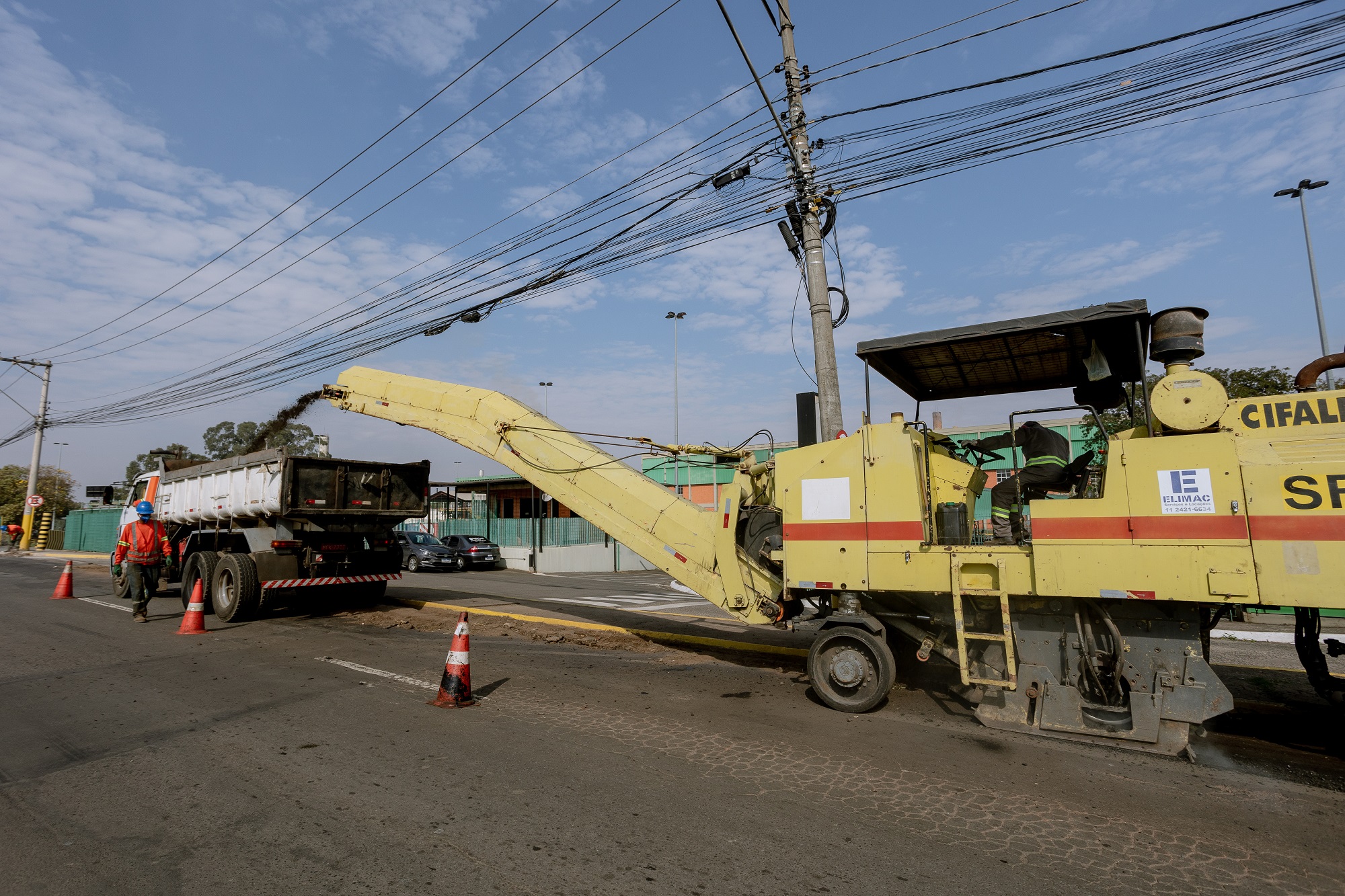 Na avenida Cristóvão Colombo, fresa de asfalto foi utilizada para retirada da superfície do asfalto e melhor acabamento do serviço (Foto: Isabela Borghese/CCS)