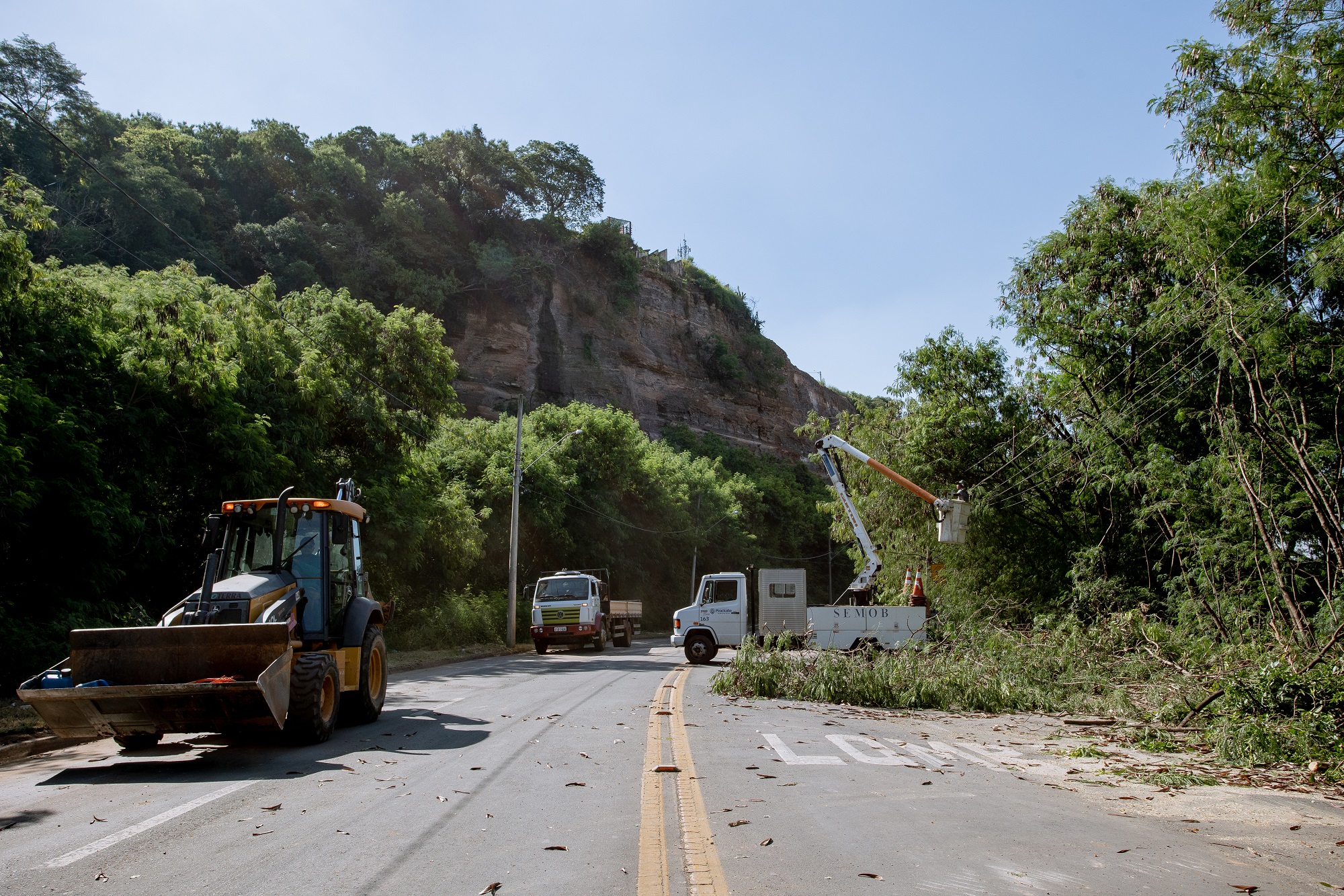 Corte de mato e poda de árvores foram executados entre ontem e hoje Laudo final apresentado em 16/01 destacou necessidade de intervenções fundamentais a serem feitas na pedreira, sendo: tombamento de rochas já condenadas, corte de árvores no topo, melhorias no sistema de drenagem no alto da pedreira, e limpeza de área próxima à avenida, para retirar os fragmentos de rocha que já se desagregaram da pedreira. Em 18/01, a Secretaria de Infraestrutura e Meio Ambiente (Simap), em conjunto com a empresa Engemaia, iniciou o corte de árvores no topo da pedreira do Bongue. Foram executados os cortes de 40 árvores no topo da pedreira, que estavam em área de risco; a medida foi necessária justamente porque essas árvores já davam indícios de que poderiam cair a qualquer momento e, por isso, precisaram ser retiradas a fim de prevenir novos desagregamentos de blocos de rocha. Além disso, a pasta também realizou 700 podas nas leucenas que ficam na avenida Jaime Pereira. Para a liberação da Jaime Pereira, a Semozel executou força-tarefa Para o tombamento das rochas com risco de cair, a Prefeitura contratou, via compra direta, a Nova SLP Negócios Empresariais e Serviços Ltda., que iniciou os trabalhos em 20/03, realizando análise do terreno no topo da pedreira, para determinação e organização do cronograma dos trabalhos, e também dialogaram com moradores da região, para explicar sobre as intervenções.