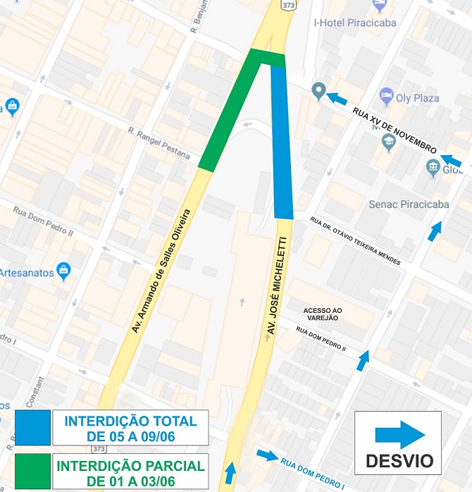 Já entre os dias 05 e 09/06, a interdição será total na José Micheletti, entre as ruas Dr. Otávio Teixeira Mendes e XV de Novembro. Durante a interdição, a rota alternativa será via rua Dom Pedro I, Santa Cruz e XV de Novembro.