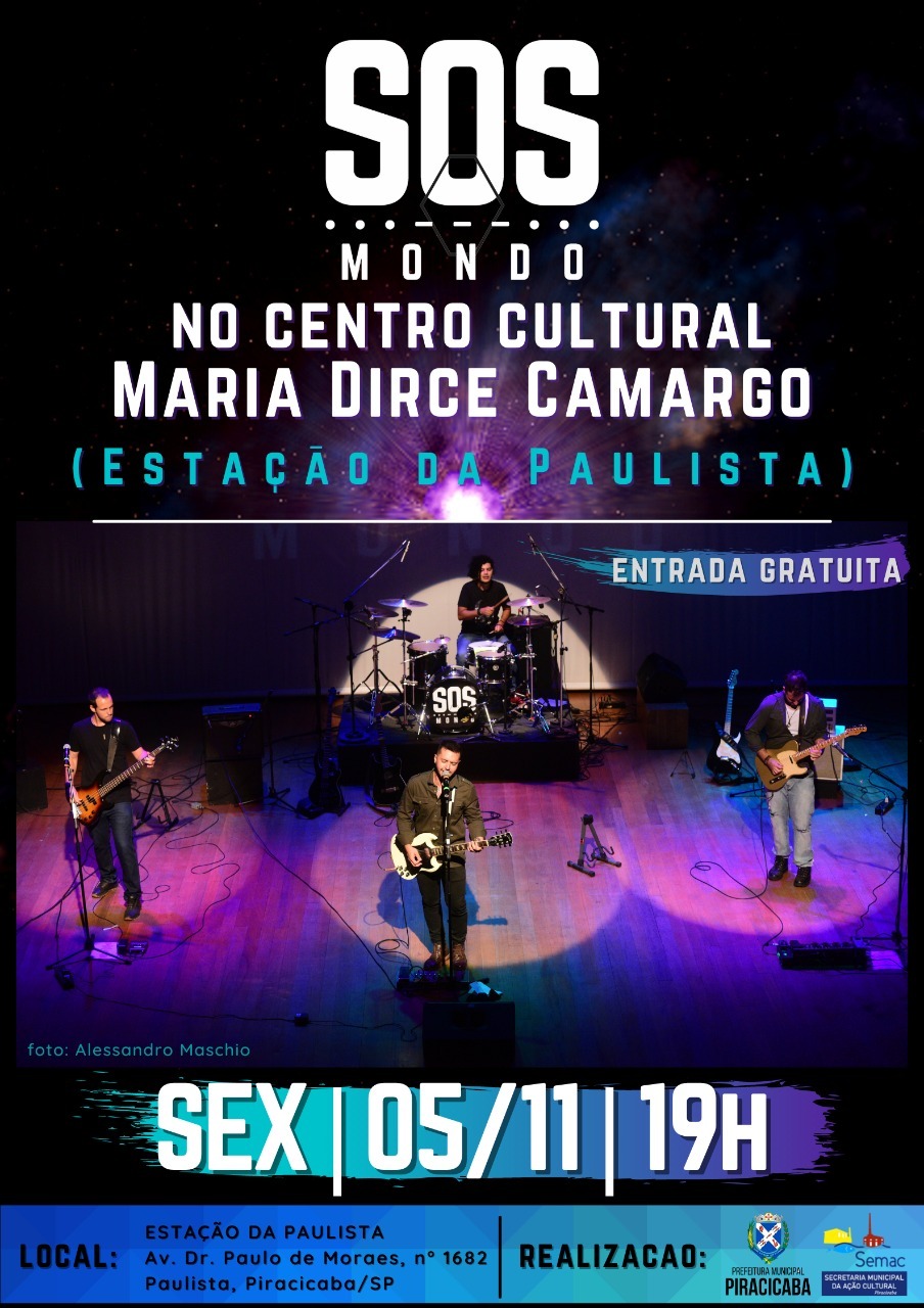 SERVIÇO – Show da Banda SOS Mondo. Sexta-feira, 05/11, às 19h. No Centro Cultural Maria Dirce de Camargo (Estação da Paulista), na avenida Dr. Paulo de Moraes, 1682. Entrada gratuita. Os ingressos serão distribuídos uma hora antes da apresentação e os lugares são limitados. Quem quiser pode doar um pacote de fralda geriátrica que será destinado ao Fussp. Todos os protocolos sanitários serão respeitados e o uso de máscara é obrigatório.