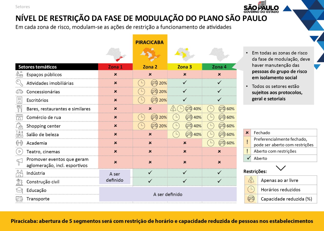 O prefeito Barjas Negri assinou o decreto Nº 18.297/2020 que institui a primeira etapa do Plano Piracicaba de Retomada das Atividades Econômicas durante flexibilização da quarentena, estabelecida para o enfrentamento da pandemia do coronavírus. A Administração segue o Plano São Paulo anunciado pelo governo do Estado, que também estendeu o período de quarentena até 15 de junho. Na tarde de ontem, 27/05, o grupo de trabalho do coronavírus se reuniu para discutir a prorrogação da quarentena no Estado e, também, a proposta de flexibilização do isolamento social. De acordo com o plano do Estado, Piracicaba se enquadra na FASE 2, que permite a abertura de atividades imobiliárias, concessionárias de veículos, escritórios, comércio em geral e shopping center, a partir do dia 1º até 15 de junho. Não haverá alteração no funcionamento da construção civil, indústria e óticas. Segundo o decreto, além das medidas do protocolo sanitário geral, como limpeza do ambiente e higienização frequente das superfícies de toques, distanciamento físico, uso obrigatório de máscaras por funcionários e clientes, limite de pessoas no espaço e disponibilização de álcool em gel, entre outras, os estabelecimentos liberados terão de tomar medidas extras. As atividades de comércio, por exemplo, deverão funcionar com restrição de horários das 9h às 17h, de segunda à sexta-feira, e aos sábados, das 9h às 13h. Além disso, também com restrição de acesso simultâneo de 20% à capacidade do estabelecimento. Os lojistas deverão seguir o Protocolo Geral do decreto, que prevê a obrigatoriedade do uso de máscaras, disposição de álcool em gel (70%), uso de EPIs dos funcionários e empregadores, limpeza e desinfecção mais frequente das áreas comuns etc. No caso das concessionárias de veículos, o atendimento aos clientes deve ser feito com controle de acesso ao showroom para evitar aglomeração. As visitas devem ser agendadas previamente, de preferência. As concessionárias também devem proteger áreas de manuseio comum pelo público em veículos de test drive e do showroom, como volante, câmbio, bancos, maçanetas, com película protetora descartável e higienizar a cada uso. Essas medidas também valem para veículos recebidos na oficina. Entre as regras para os shopping centers, está o funcionamento com 20% da capacidade de pessoas definidas no AVCB (Auto de Vistoria do Corpo de Bombeiros) e horário de funcionamento das 10h às 21h, de segunda a sábado, também com restrição de acesso de pessoas. A abertura aos domingos está vedada. Outras regras serão a medição da temperatura corporal de cada pessoa que entrar no shopping, aplicação de antibactericidas nos tapetes de entrada para desinfecção dos calçados e instalação de dispositivos para garantir o distanciamento social, entre outras. Cinemas, academiais, áreas kids, praça de alimentação e outras atividades que possam gerar aglomeração, não funcionarão nos shoppings.