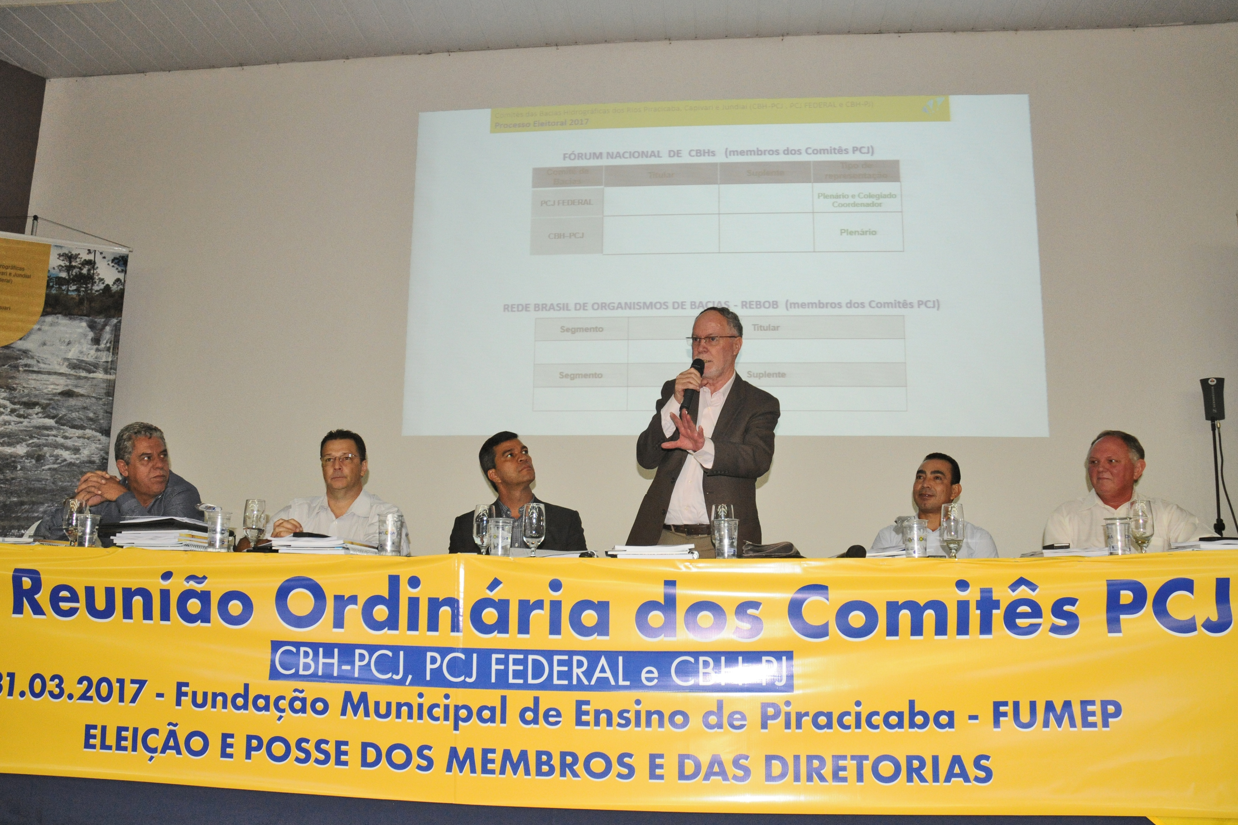 O prefeito de Piracicaba, Barjas Negri, foi eleito presidente para o mandato 2017-2019 dos Comitês PCJ, entidade responsável pela gestão dos recursos hídricos nas Bacias dos Rios Piracicaba, Capivari e Jundiaí), na manhã de hoje, 31/03, durante a primeira reunião plenária de 2017, que aconteceu no auditório da Fumep (Fundação Municipal de Ensino de Piracicaba). Além do presidente, foram eleitos novos membros da diretoria e da sociedade civil (usuários e organizações civis) e indicados pelos órgãos governamentais (municípios, estados e União). Durante a reunião ainda foram votados e aprovados outros assuntos e deliberações importantes.