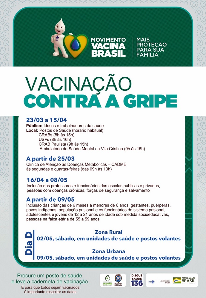 O Ministério da Saúde tomou a decisão de realizar esta campanha com um mês de antecedência, que historicamente acontecia em abril, pelo momento que o mundo passa no combate ao coronavírus. Apesar desta vacina não prevenir contra esse novo vírus, ajuda no diagnóstico diferencial do mesmo. Vale lembrar que os sintomas desta doença são semelhantes aos do coronavírus e essa antecipação visa reduzir a carga da circulação de influenza e H1N1 na população e minimizar o impacto sobre os serviços de saúde. A síndrome gripal é uma doença respiratória infecciosa de origem viral, que pode levar ao agravamento e ao óbito, especialmente nos indivíduos que apresentam fatores ou condições de risco para as complicações da infecção ( idosos com 60 anos ou mais, profissionais da saúde, portadores de doenças crônicas não transmissíveis, crianças menores de 5 anos de idade, gestantes e outras condições especiais. Assim, a vacinação dos grupos prioritários é fundamental como uma estratégia de prevenção, para a redução da ocorrência da doença, internações e óbitos. Cronograma de vacinação da população alvo: 23/03 a 15/04: idosos e trabalhadores da saúde; 16/04 a 08/05: inclusão dos professores e funcionários das escolas públicas e privadas, pessoas com doenças crônicas, forças de segurança e salvamento; A partir de 09/05: inclusão das crianças de 6 meses a menores de 6 anos, gestantes, puérperas, povos indígenas, população prisional e os funcionários do sistema prisional, adolescentes e jovens de 12 a 21 anos de idade sob medida socioeducativas, pessoas na faixa etária de 55 a 59 anos. Dia D, para vacinação todos os grupos prioritários: Zona Rural – dia 2 de maio, sábado, em unidades de saúde e postos volantes Zona Urbana – dia 9 de maio, sábado, em unidades de saúde e postos volantes